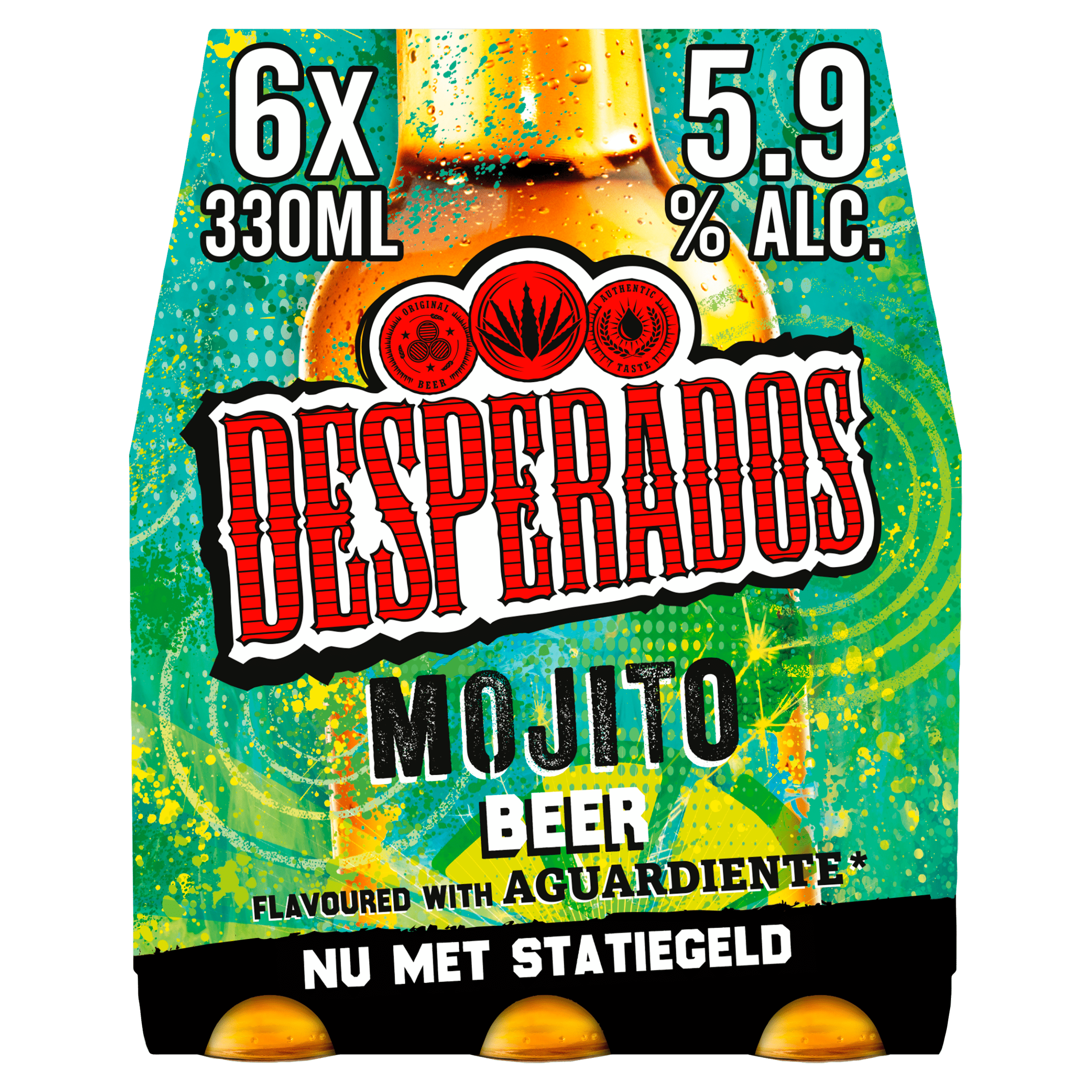 Ervaar de tropische smaak van Desperados Mojito Bier! Dit unieke bier is verrijkt met de verfrissende smaken van limoen en munt, geรฏnspireerd op de beroemde Mojito cocktail. Met een alcoholpercentage van 5.9% is het de ideale keuze voor een feest of een gezellige avond met vrienden. Geniet van een fris en zoet biertje dat perfect is voor elk moment.
