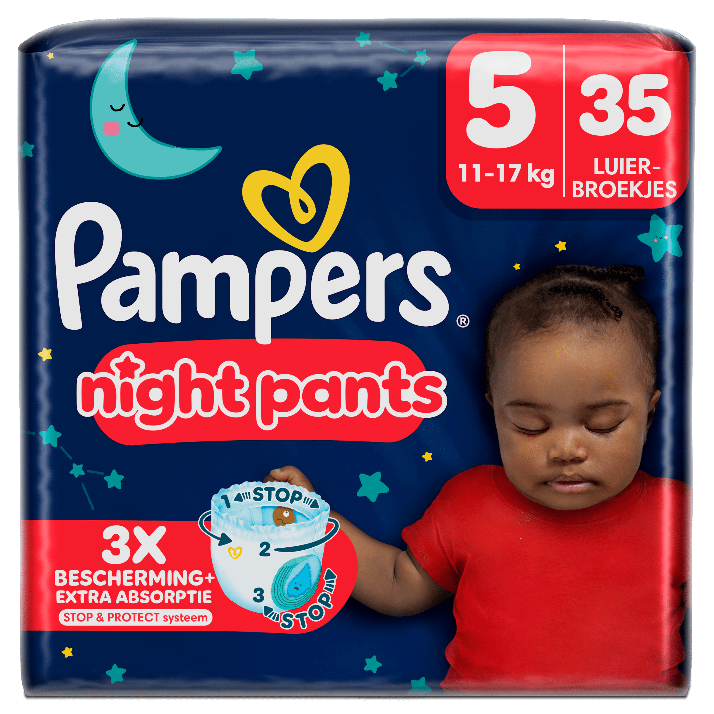 Geef je baby de beste nachtrust met de Pampers Baby-dry Pants maat 5. Deze luierbroekjes zijn ontworpen met de meest absorberende kern voor tot 100% lekvrije nachten. Dankzij de 360ยฐ pasvorm passen ze zich aan de bewegingen van je baby aan, terwijl de Stop & Protect pocket lekken aan de achterkant voorkomt. De broekjes zijn eenvoudig aan te trekken en te verwisselen, zodat je ook tijdens de nacht snel kunt handelen. Dermatologisch getest en goedgekeurd voor de gevoelige huid van je baby.
