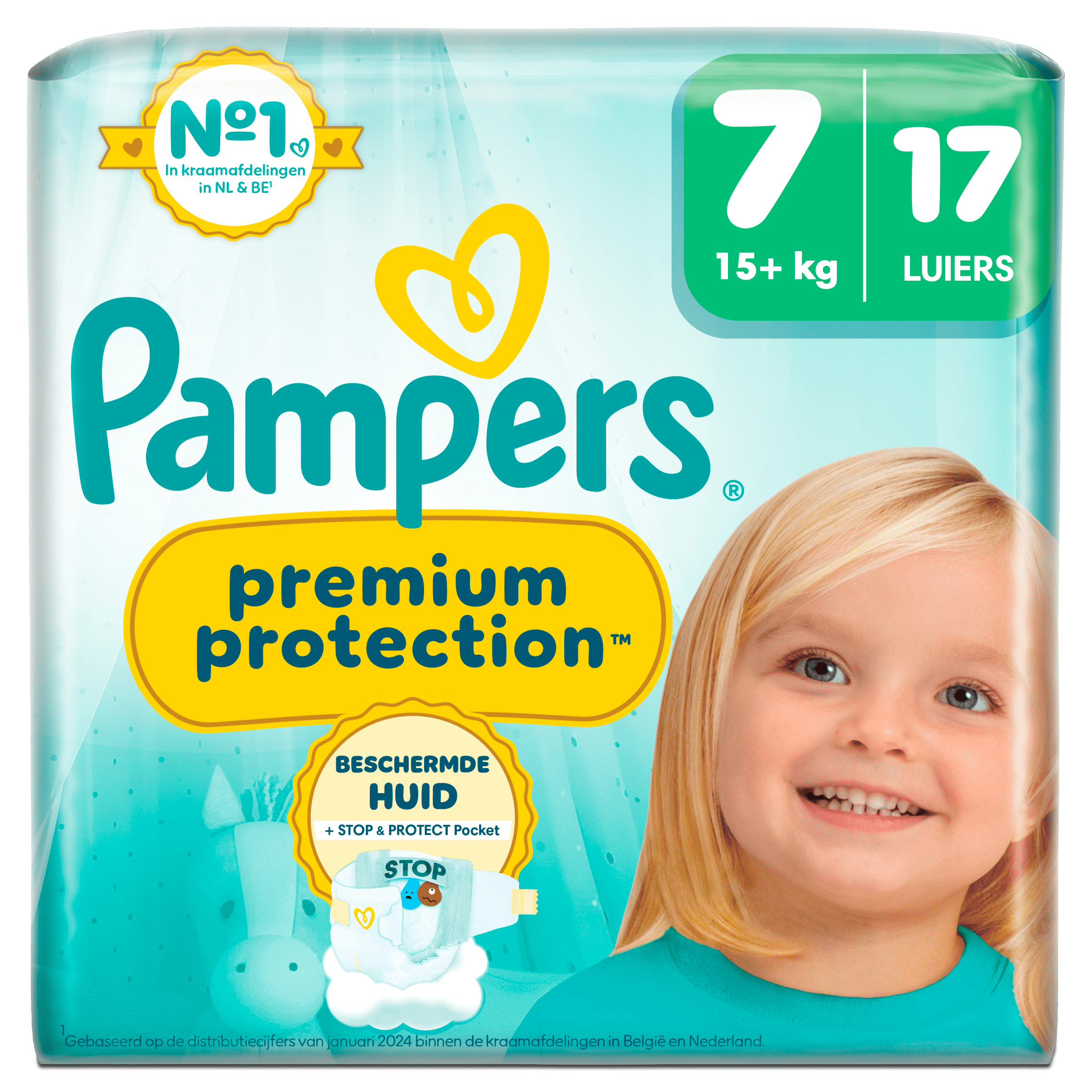 Pampers Premium Protection S7 Key Size biedt dubbele bescherming voor de gevoelige huid van je baby met onmiddellijke absorptie en een innovatieve Stop & Protect pocket die lekken voorkomt. Deze luiers zijn dermatologisch getest, gemaakt van ultrazachte materialen en bevatten geen EU-parfumallergenen. De Nยฐ1 keuze van kraamafdelingen in Nederland – ideaal voor de comfortabele verzorging van je kleintje.