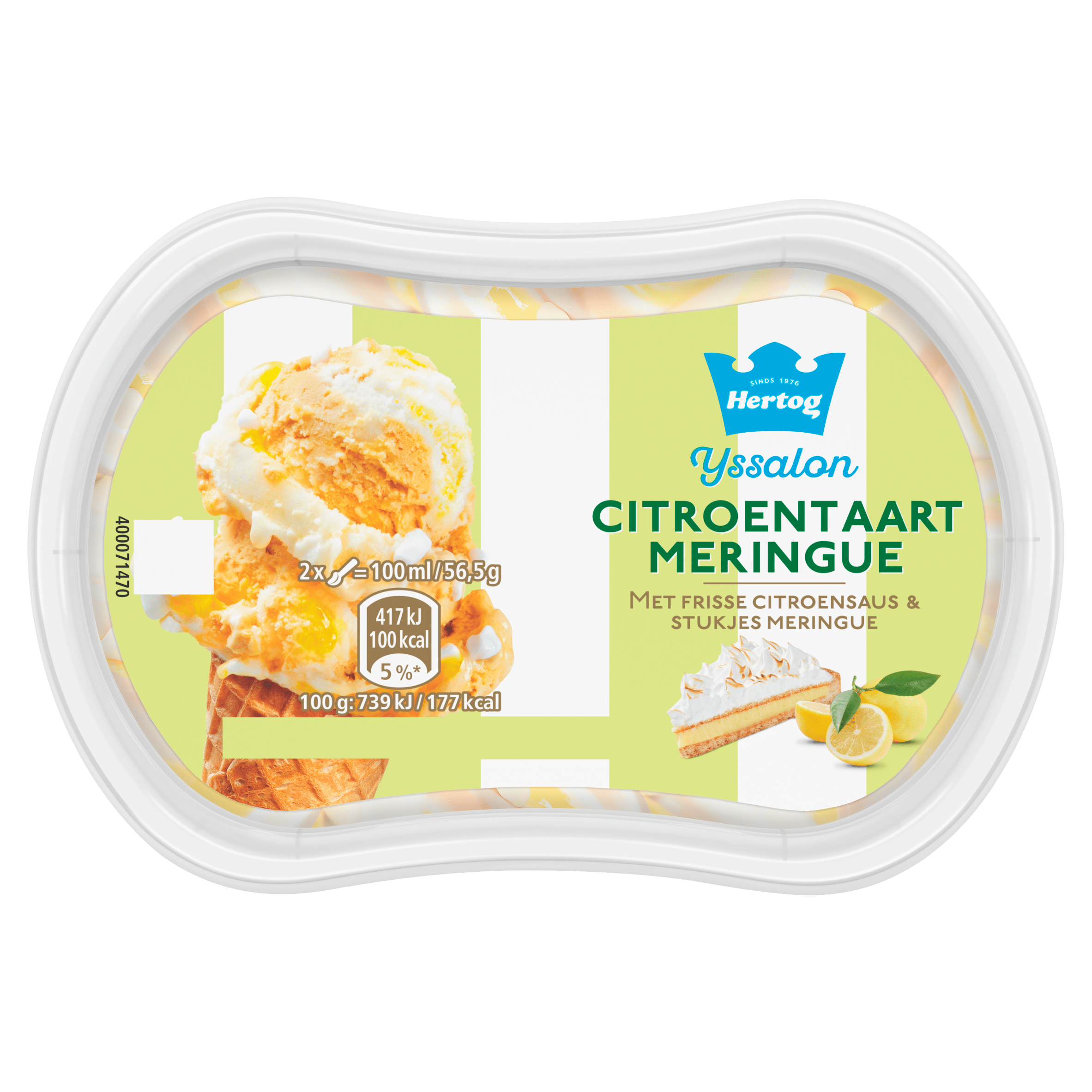 Geniet van de verrukkelijke Hertog Citroentaart Meringue, een dessert dat een echte smaaksensatie biedt. Dit romige citroenijs, overgoten met een frisse citroensaus en verrijkt met stukjes meringue, creรซert een onvergetelijke ervaring. Vrij van kunstmatige kleur- en smaakstoffen, is dit ijs perfect voor een leuk samenzijn, als nagerecht of gewoon om jezelf te verwennen. Een luxueuze traktatie voor elke ijsliefhebber!