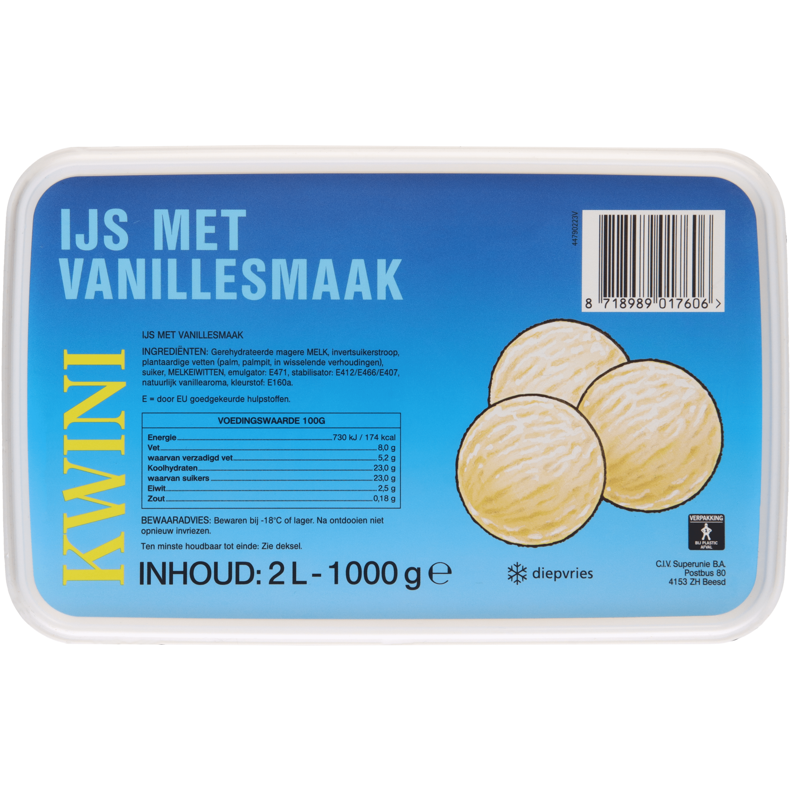 Geniet van de romige smaak van Kwini Vanille IJs, een verrukkelijke ijsvariant die vriesvers wordt geleverd. Dit heerlijke dessert is perfect voor elke gelegenheid en is vegetarisch. Bewaar het bij -18ยฐC of lager voor de beste kwaliteit. Na ontdooien niet opnieuw invriezen.