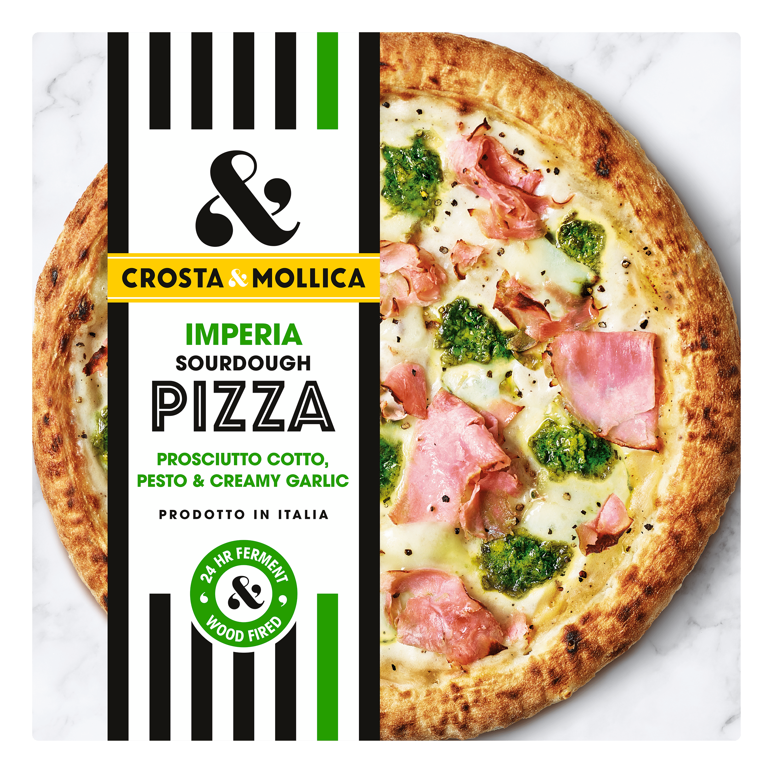 Breng de authentieke smaak van Italiรซ naar jouw keuken met de Crosta & Mollica Pizza Imperia. Deze diepvriespizza is gemaakt van zuurdesem deeg, voorgebakken in een houtoven en rijkelijk belegd met prosciutto cotto, basilicum pesto en een romige knoflooksaus. Perfect voor een snel diner, met een rijke smaak die je meeneemt naar de Italiaanse pizzeria. Ideaal voor een gezellige avond met vrienden of familie.