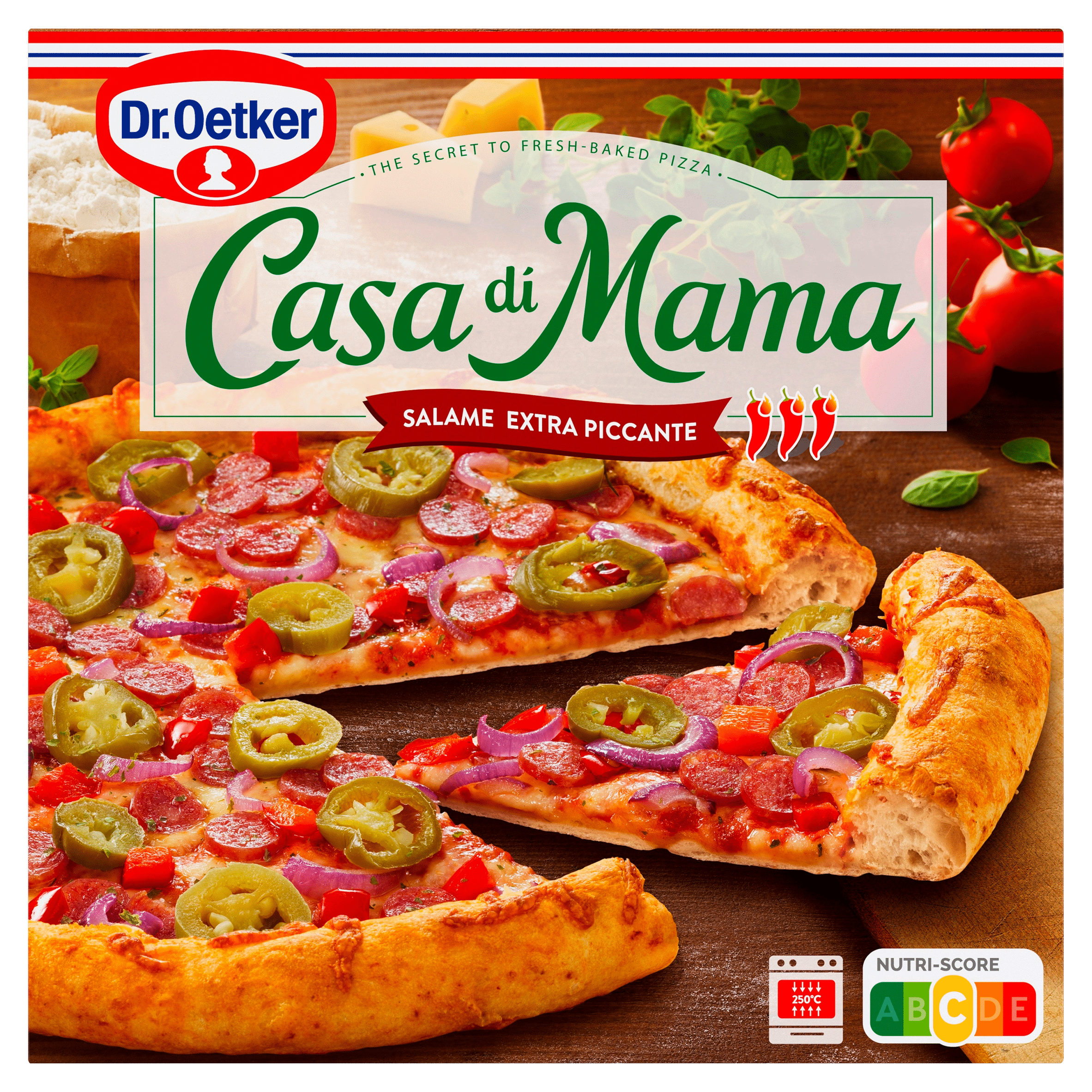Geniet van de authentieke smaak van Italiรซ met de Dr. Oetker Casa di Mama pizza salame piccante. Deze verrukkelijke pizza is voorzien van een krokante dunne bodem en een luchtige, dikke korst. Rijkelijk belegd met tomatenpuree, mozzarella, edammer kaas en een pittige pepperoni-salami, brengt deze pizza de perfecte balans tussen smaak en textuur. Ideaal voor een snelle maaltijd, eenvoudig te bereiden in de oven. Vriesvers en met Nutri-Score C, zo ben je verzekerd van een smaakvolle maaltijd met goede ingrediรซnten.