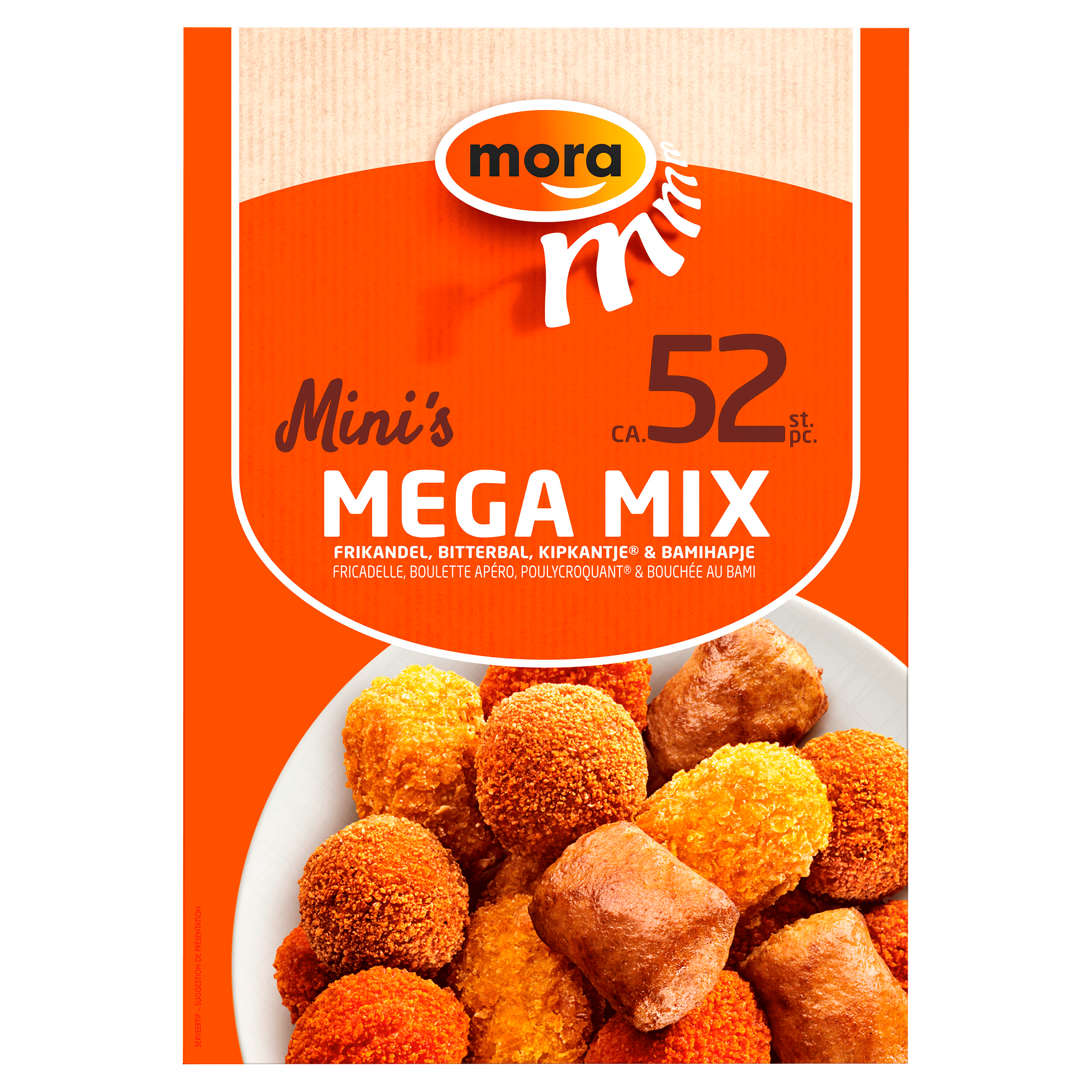 Geniet van de heerlijke Mora Mini’s Mega Mix, een perfecte selectie van vier populaire snacks: frikandel, bitterbal, kipkantje en bamihapje. Deze snacks zijn vriesvers en bereid zonder kunstmatige geurstoffen, zodat je kunt genieten van een authentieke smaak. Ideaal voor een feestje of als tussendoortje! Eenvoudig te bereiden in de friteuse in slechts 4 minuten.