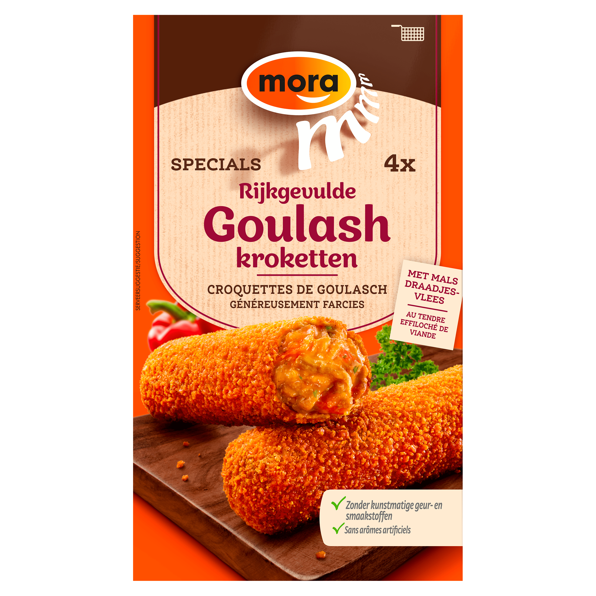 Geniet van de heerlijke Mora Specials Rijkgevulde Goulash Kroketten, verrijkt met mals rundvlees en een pittige smaak door paprika en kruiden. Deze kroketten zijn krokant van buiten en smeuรฏg van binnen. Perfect voor een snelle, smaakvolle snack zonder kunstmatige geurstoffen. Ideaal voor elke gelegenheid!