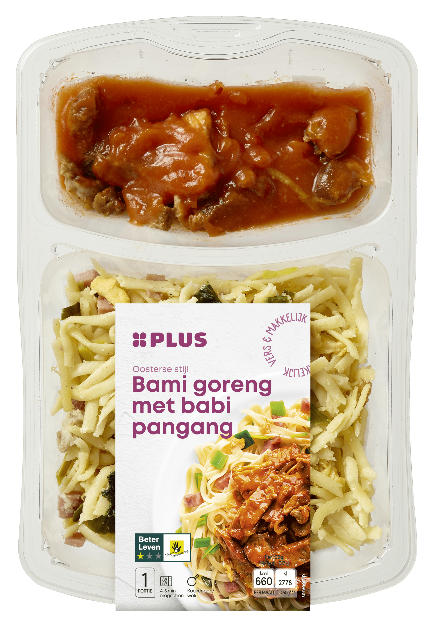 Geniet van de smaakvolle PLUS Bami Goreng met krokante Babi Pangang. Deze heerlijke maaltijd bestaat uit noedels en mals varkensvlees, met een pittige tomatensaus die zorgt voor een authentieke smaakervaring. Gekoeld bewaren voor optimale versheid.