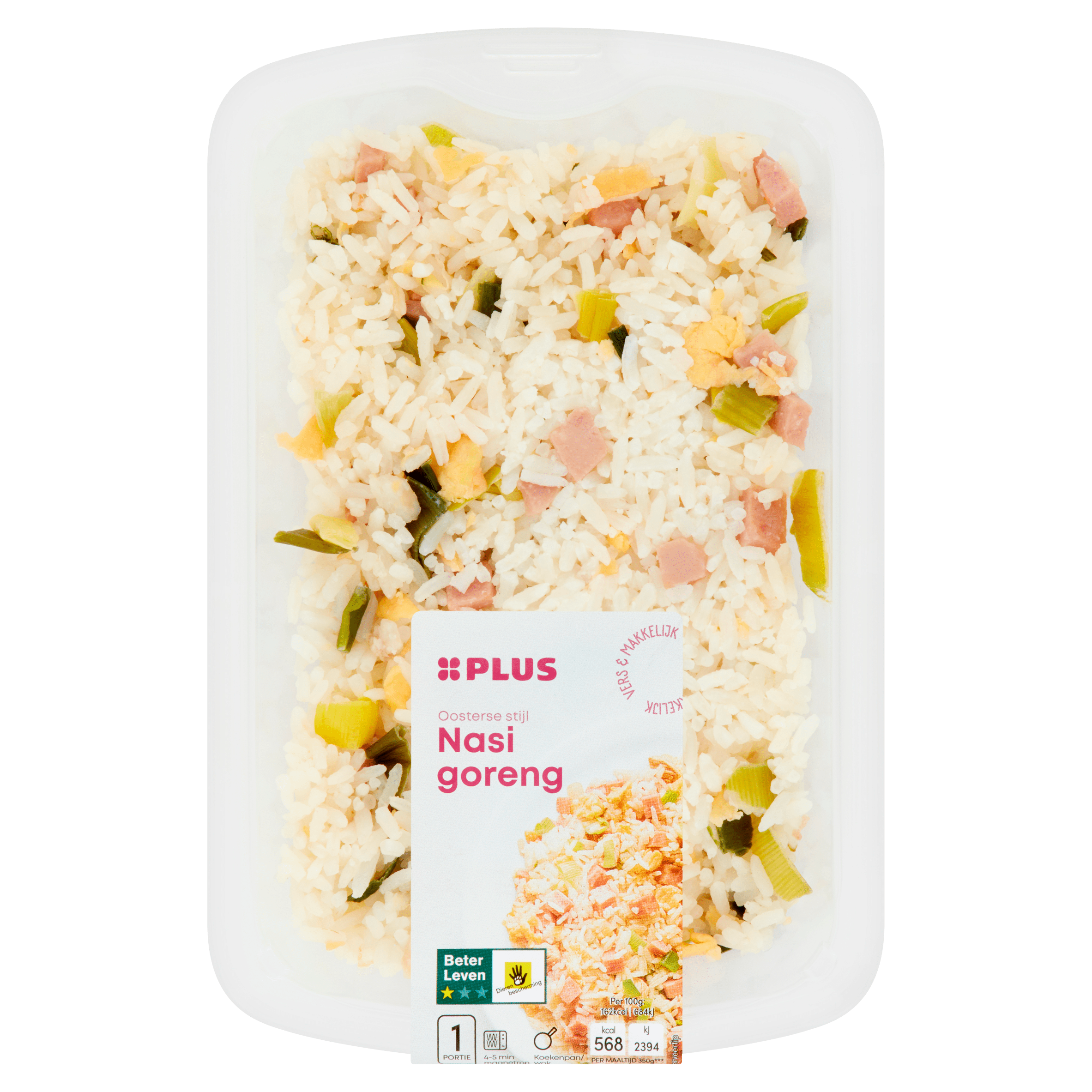 Geniet van de heerlijke PLUS Nasi Goreng, een smaakvolle combinatie van gekookte rijst, ham, varkensvlees en ei met een geurige mix van prei en specerijen. Dit gerecht bevat het Beter Leven keurmerk, wat betekent dat je bijdraagt aan dierenwelzijn. Perfect voor een snelle en smakelijke maaltijd.