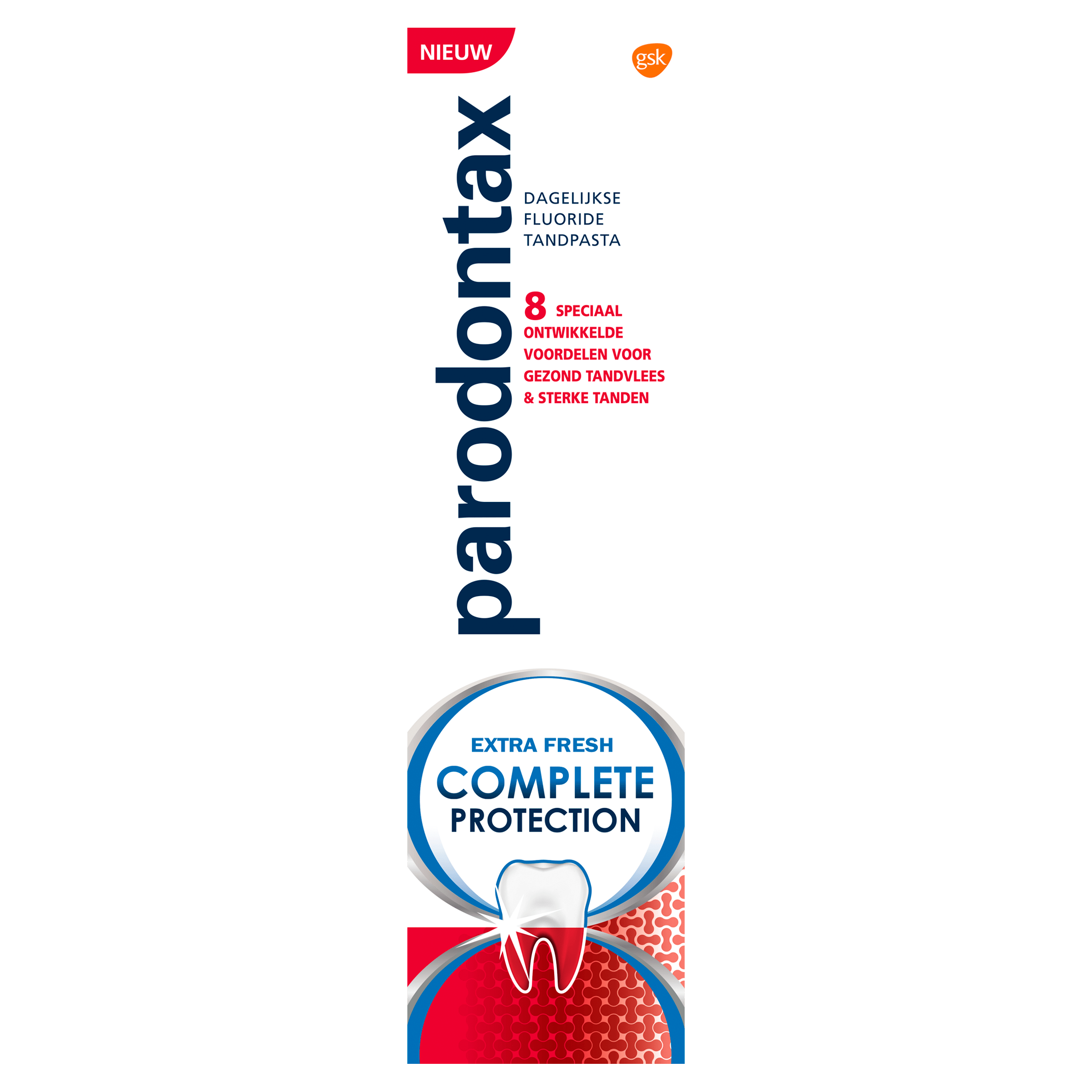 Parodontax Complete Protection Fresh tandpasta biedt 8 voordelen voor gezond tandvlees en sterke tanden. Het is 4 keer effectiever in het verwijderen van tandplak dan reguliere tandpasta’s. Dankzij de unieke samenstelling met natriumbicarbonaat en fluoride helpt het tegen bloedend tandvlees en zorgt het voor een frisse adem. Dit product zorgt ook voor een diepe reiniging tussen de tanden, waardoor je kan genieten van een schoon en fris gevoel. Met fluoride draagt het bij aan sterker tandglazuur. Ideaal voor dagelijks gebruik.