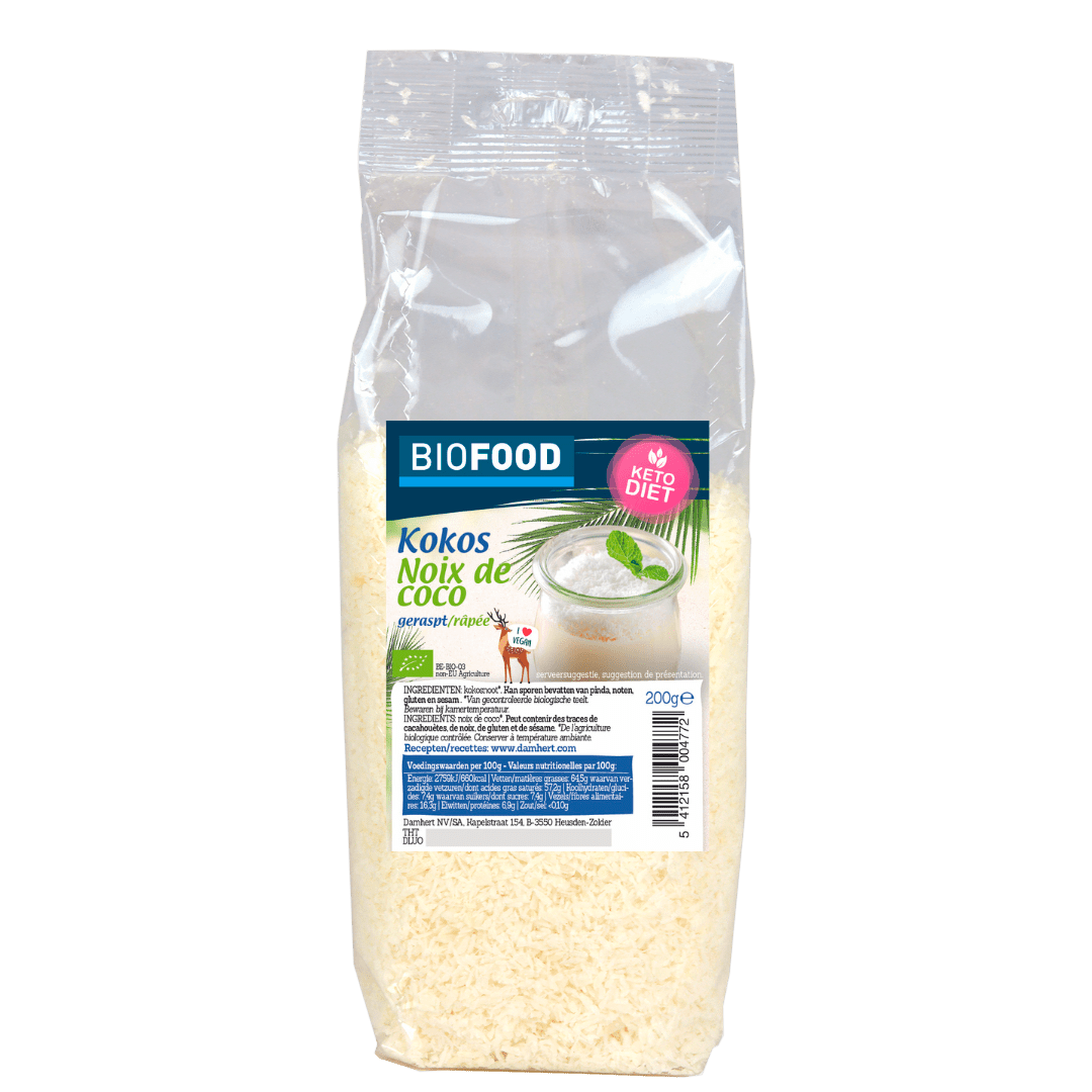 Geniet van de heerlijke smaak van Biofood Geraspte kokos, een perfecte aanvulling voor al je nagerechten en gezond ontbijt. Deze biologische geraspte kokos geeft een subtiele kokos toets aan jouw muesli, smoothies, shakes, energy balls en granola. Bewaar de kokos droog en goed afgesloten voor de beste smaak.