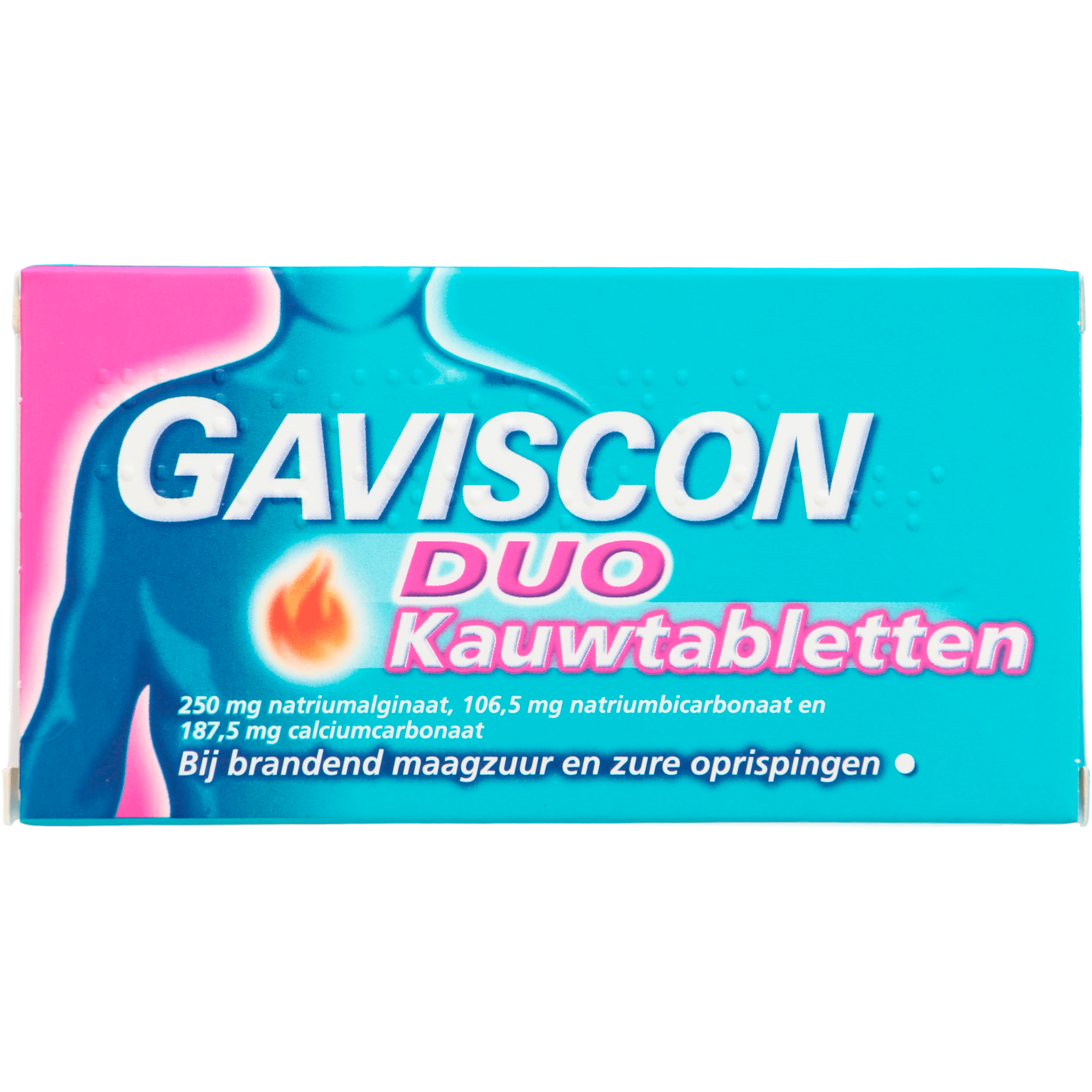 Gaviscon Duo kauwtabletten bieden effectieve verlichting bij brandend maagzuur en zure oprispingen. Deze kauwtabletten helpen de symptomen snel te verminderen door de unieke combinatie van natriumalginaat, natriumbicarbonaat en calciumcarbonaat. Ideaal voor volwassenen en kinderen boven de 12 jaar. Kauw 2 tot 4 tabletten na de maaltijden en voor het slapengaan voor het beste resultaat. Lees de bijsluiter voor specifieke doseringsinstructies.