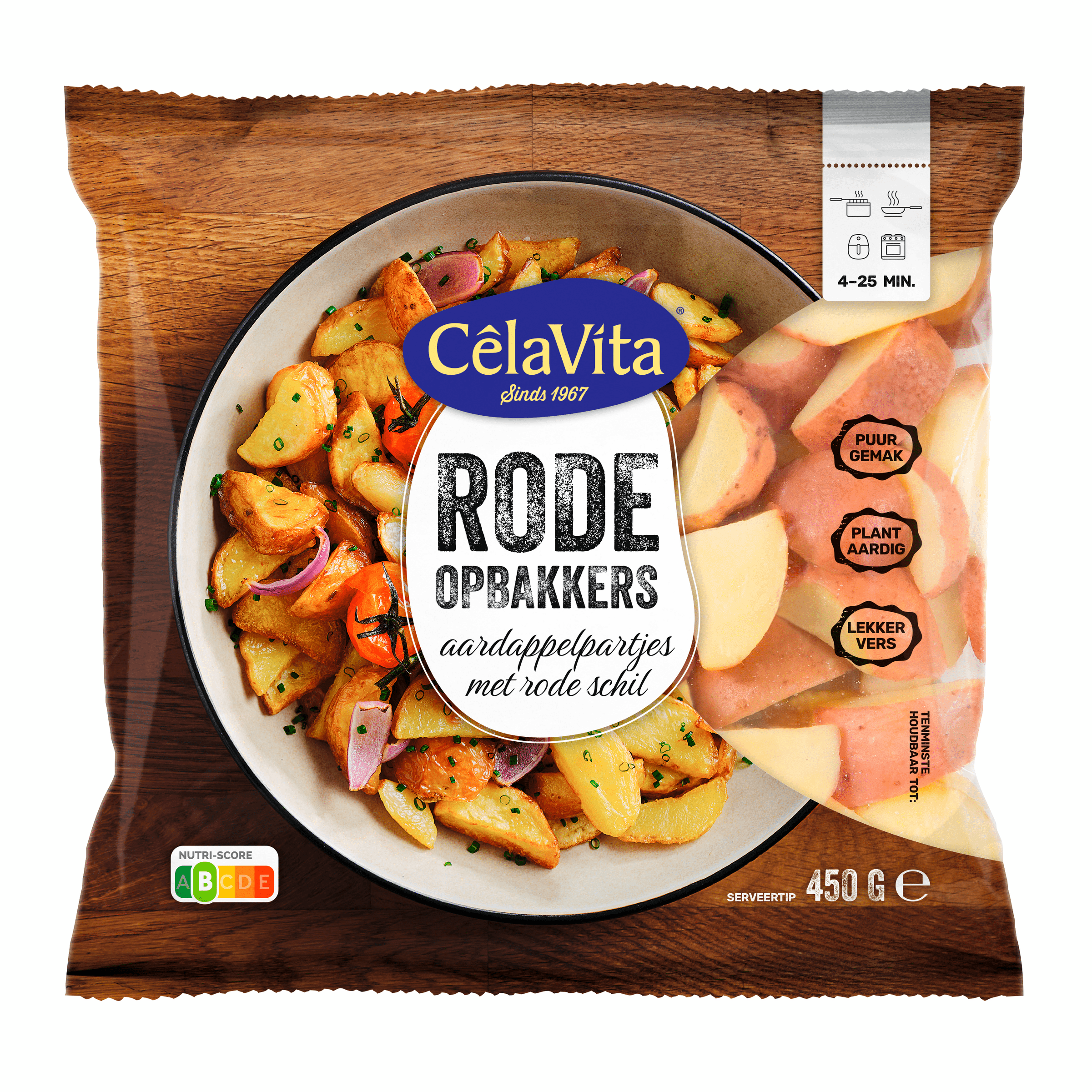 Geniet van de heerlijke CelaVita Oma’s opbakaardappeltjes met een smaakvolle rode schil. Deze voorgekookte aardappelpartjes zijn perfect om snel en gemakkelijk te bereiden. Bak ze in een pan met boter of olie voor een goudgeel en knapperig resultaat binnen 10-12 minuten. Een smakelijke toevoeging aan elke maaltijd, boordevol smaak en een aangename bite door de schil. Ideaal voor een snelle lunch of diner!