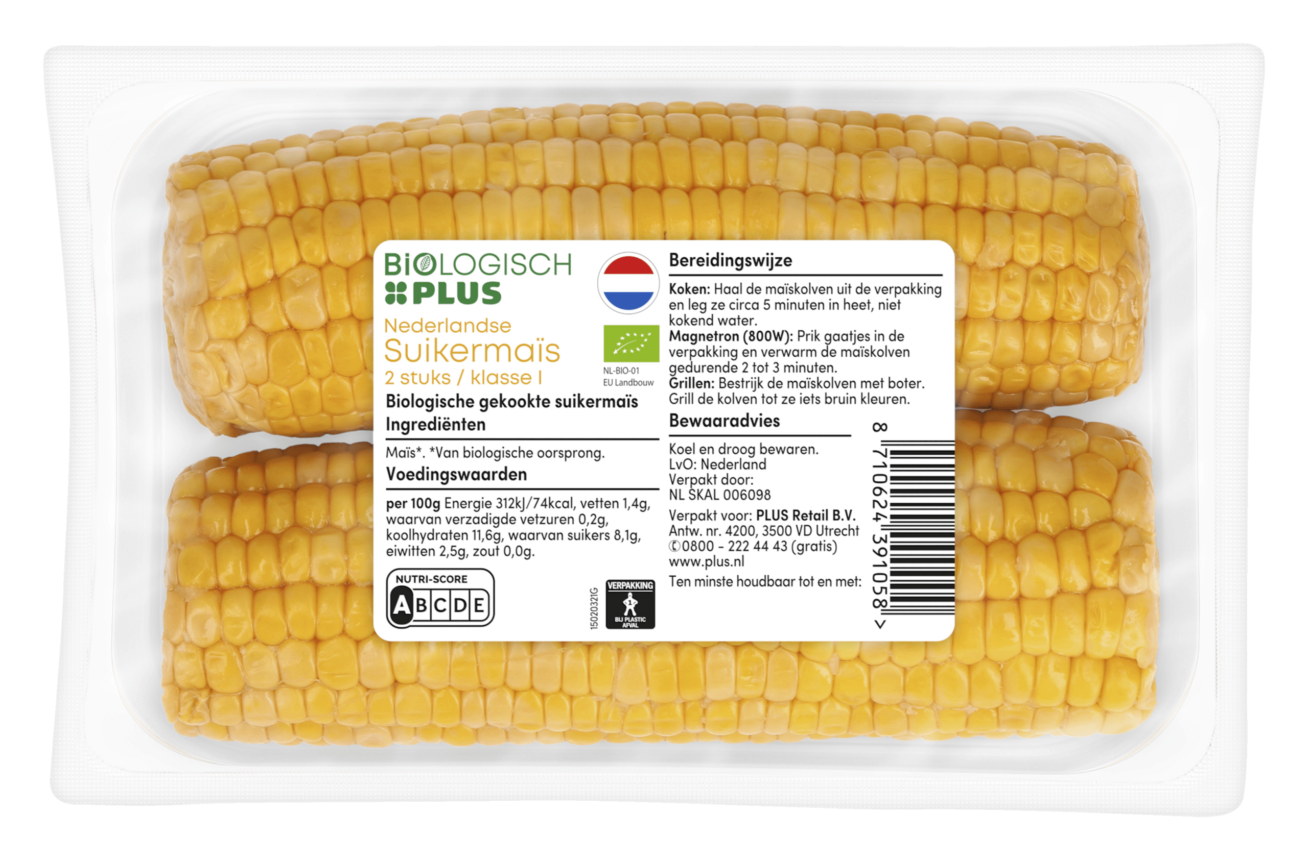 Geniet van de smaak van Biologisch PLUS Suikermais, zorgvuldig geselecteerd van biologische oorsprong en met Nutri-Score A. Deze heerlijke maรฏskolven zijn veelzijdig en eenvoudig te bereiden: kook ze in 5 minuten, verwarm ze in de magnetron in slechts 2 tot 3 minuten, of grill ze voor een extra smaakdimensie.