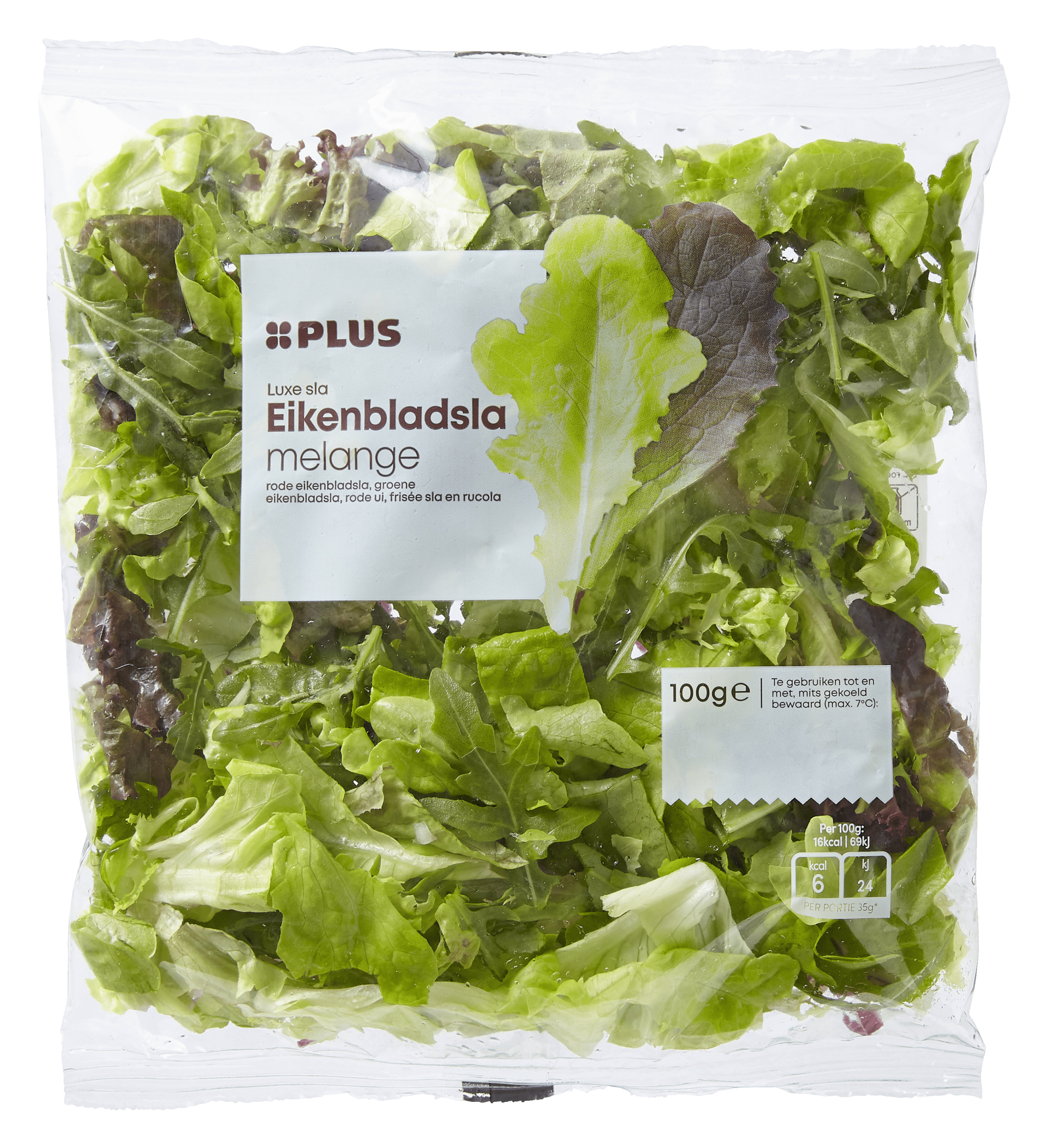 35% rode eikenbladsla, 35% groene eikenbladsla, 10% rode ui, 10% frisee, 10% rucola.