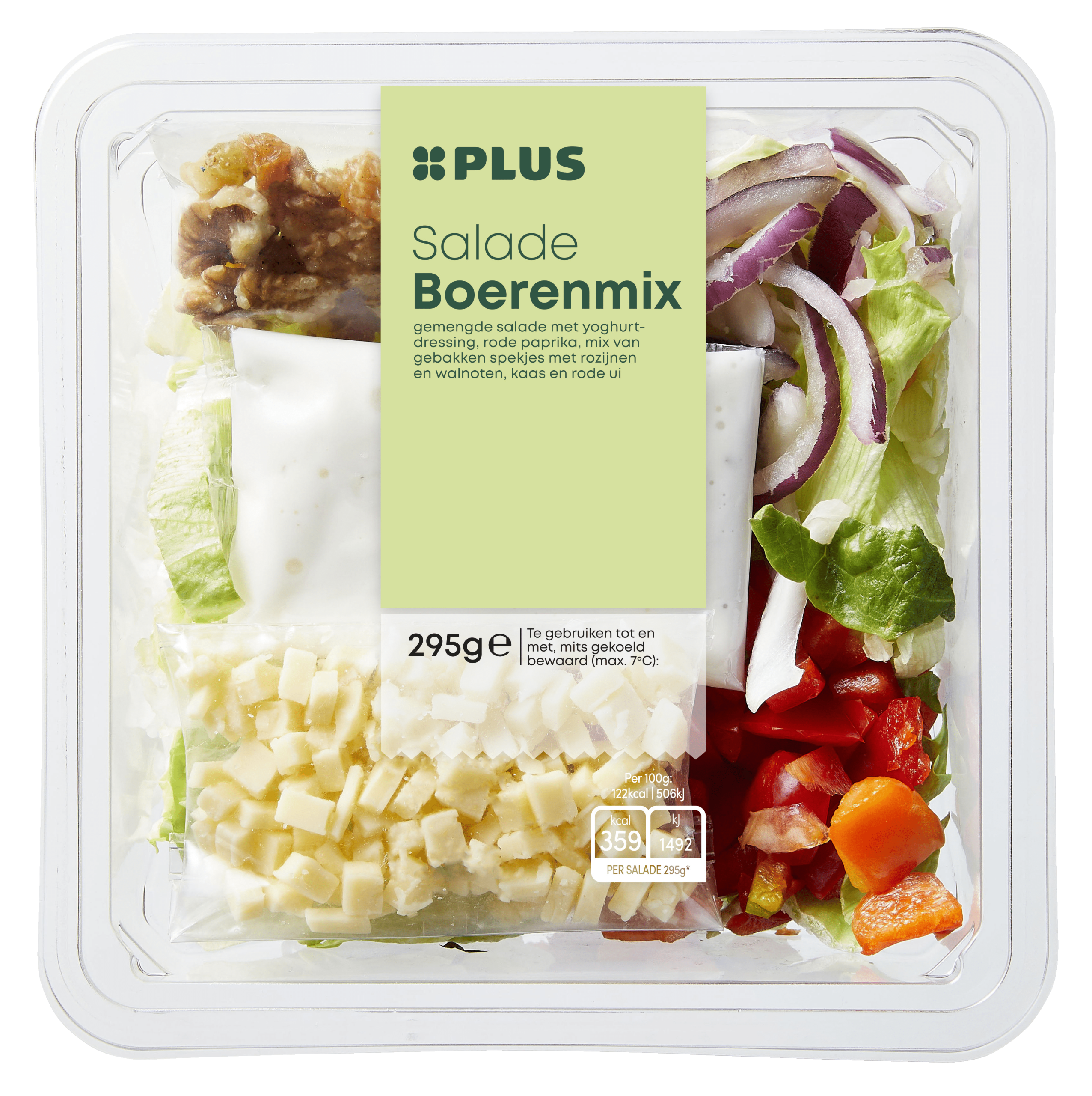 Geniet van de PLUS Salade Boerenmix, een frisse en smakelijke combinatie van ijsbergsla, yoghurtdressing, paprika, gebakken spekjes met rozijnen en walnoten, kaas en rode ui. Deze salade is perfect als lichte maaltijd, bijgerecht of als gezonde snack. Gekoeld bewaren voor de beste smaak.