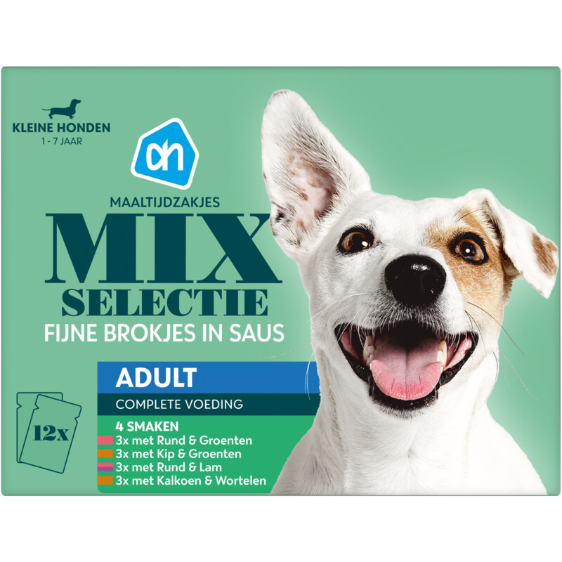 AH Maaltijdzakjes selectie in saus mini zijn de ideale maaltijd voor jouw kleine hond. Deze fijne brokjes in een smakelijke saus zijn speciaal ontwikkeld om te voldoen aan de voedingsbehoeften van kleinere honden. Met vier heerlijke smaken: 3x kip & groenten, 3x rund & lam, 3x rund & groenten en 3x kalkoen & wortelen. Elke portie is verrijkt met essentiรซle vitamines zoals D3 voor sterke botten en E voor een gezond immuunsysteem.