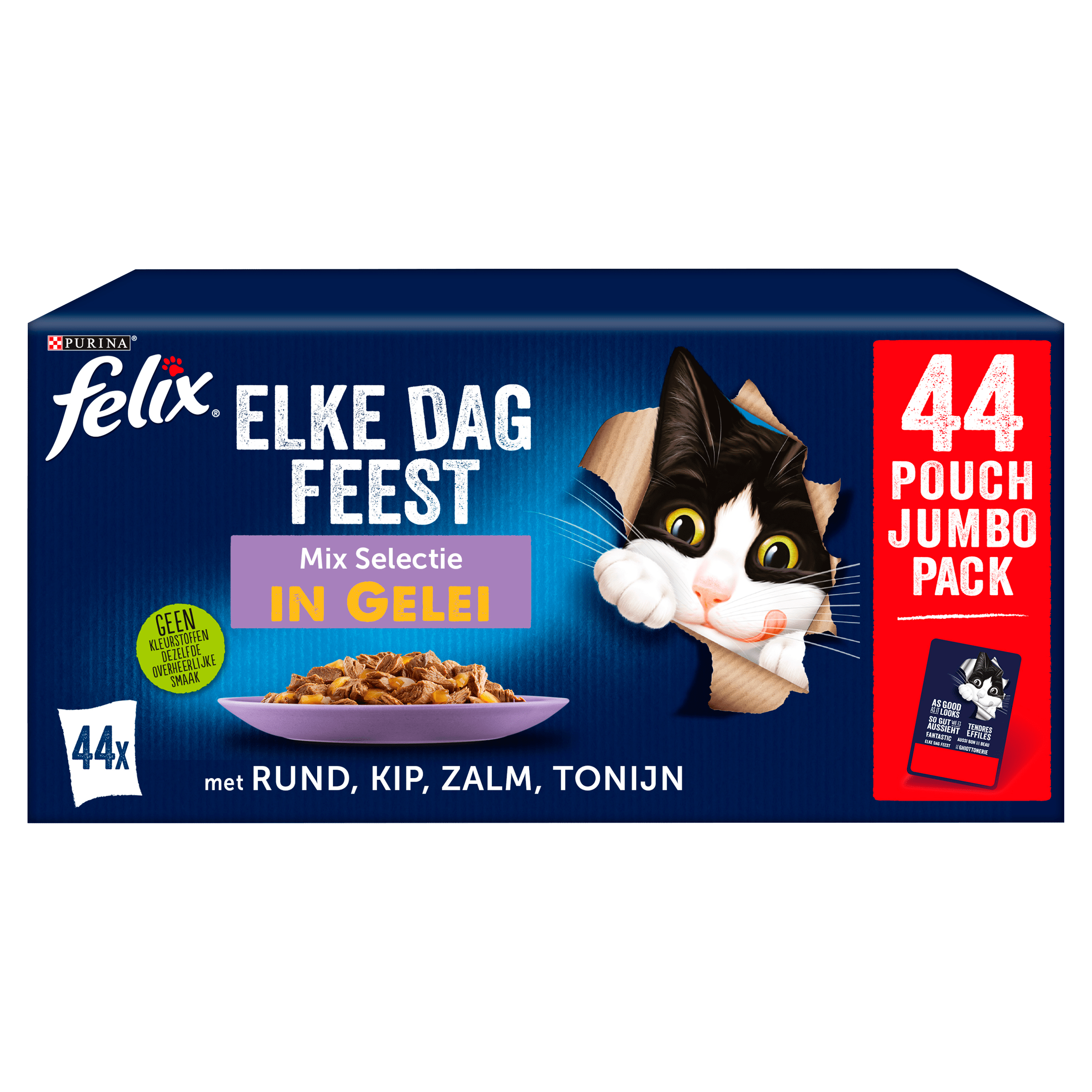 Felix Elke Dag Feest is een assortiment van onweerstaanbare maaltijden voor je kat die er heerlijk uitzien en ruiken alsof je ze zelf hebt bereidt. Deze maaltijden bevatten malse stukjes in gelei en zijn gemaakt van hoogwaardige ingrediรซnten. Ze zijn niet alleen lekker, maar bieden ook een bron van omega-6-vetzuren en bevatten een perfecte mix van vitamines. Dit maakt Felix een complete voeding die voldoet aan de dagelijkse behoeften van jouw kat, perfect voor als je kattenkwaad wilt voorkomen. Geef jouw kat de variatie die hij verdient met Felix Elke Dag Feest, omdat elke dag een feest moet zijn!