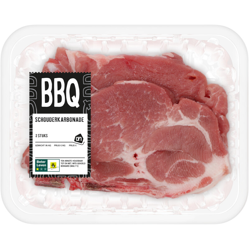 Geniet van de malse AH Schouderkarbonade, gemaakt van varkensvlees van Nederlandse boeren met een Beter Leven 1 Ster keurmerk. Dit keurmerk garandeert een beter leven voor de dieren, met meer ruimte en aandacht voor hun welzijn. Deze schouderkarbonade heeft een iets grovere structuur dan de ribkarbonade, waardoor hij uitermate geschikt is voor stoven en smoren. Perfect te combineren met aardappelen en seizoensgroenten. Marineer voor een heerlijke barbecue-ervaring!