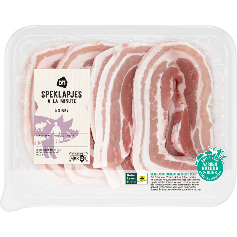 Geniet van de heerlijke, ouderwetse smaak van AH Speklapjes à la Minute. Deze extra dunne varkensspeklapjes zijn perfect voor een snelle maaltijd! Met het 1 ster beter leven keurmerk waarborgen we niet alleen een topkwaliteit product, maar ook dierenwelzijn. Marineer ze met honing en mosterd voor een verrukkelijke combinatie. Ideaal voor in de koekenpan, op de BBQ of grill – binnen 4 minuten klaar om van te genieten!