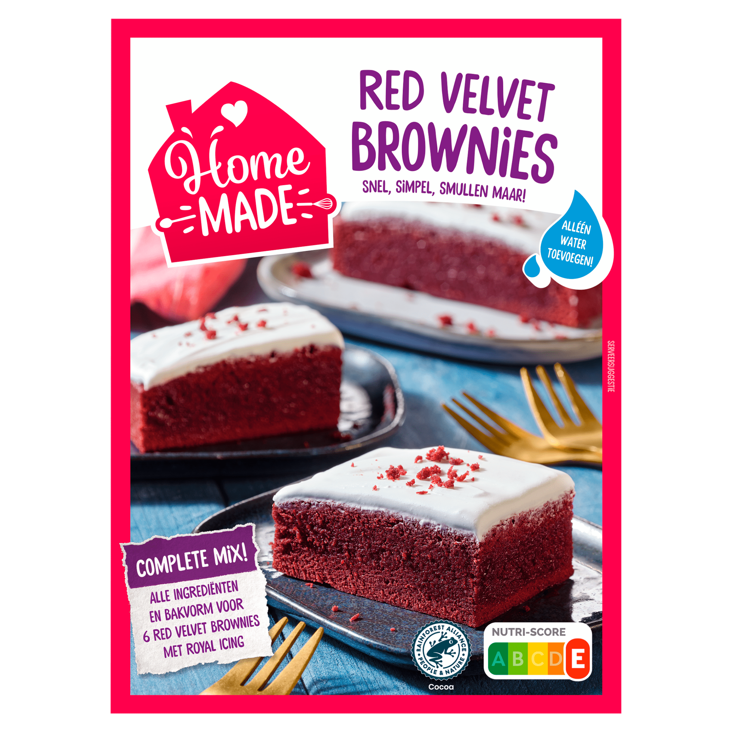 Bak eenvoudig en snel heerlijke Red Velvet brownies met onze complete mix! Voeg alleen water toe en je hebt alles wat je nodig hebt om zes luchtige brownies met een royale icing te maken. Perfect voor gezellige momenten of als traktatie. Bewaar de brownies in de koelkast na bereiding voor een langere houdbaarheid.