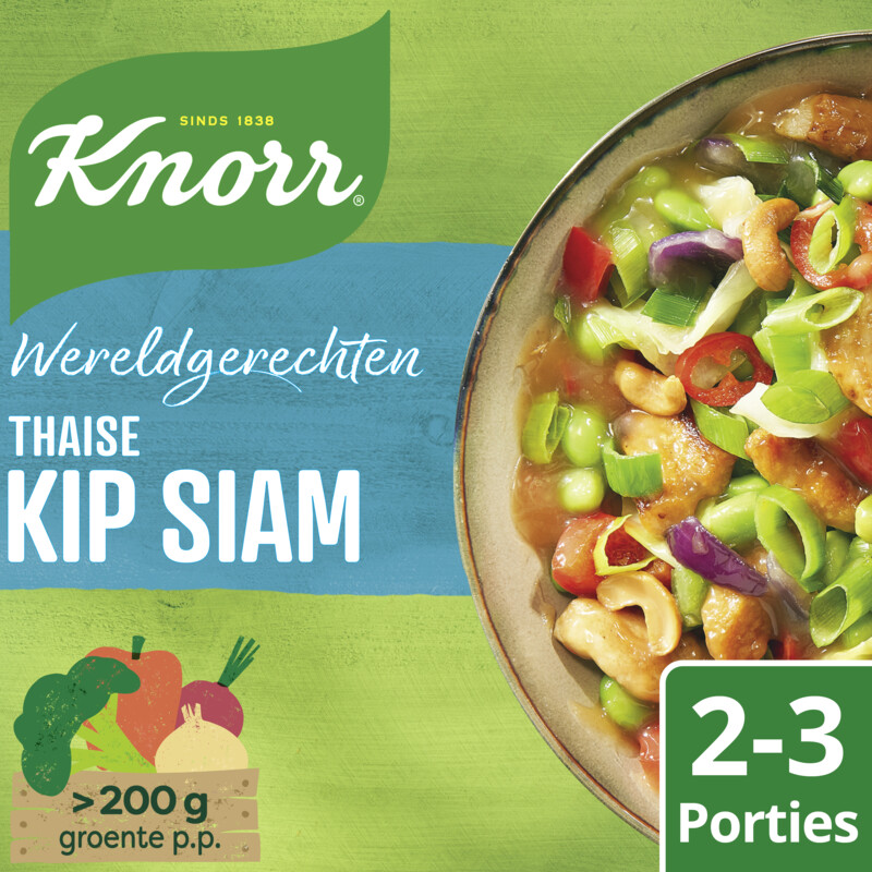 Met Knorr Wereldgerechten Thaise Kip Siam maak je gemakkelijk en snel een heerlijke maaltijd die boordevol groenten zit. Dit maaltijdpakket bevat een smakelijke rijstmix, een rijke sausmix en cashewnoten. Bereid het met minimaal 200 g verse groente voor een smaakvolle ervaring die je even in de Thaise keuken laat wanen. Geniet van de perfecte balans tussen gemak en smaak, zonder kunstmatige kleurstoffen en toegevoegde smaakversterkers. Ideaal voor 2-3 personen en ook een uitstekende keuze voor een vleesloze dag.