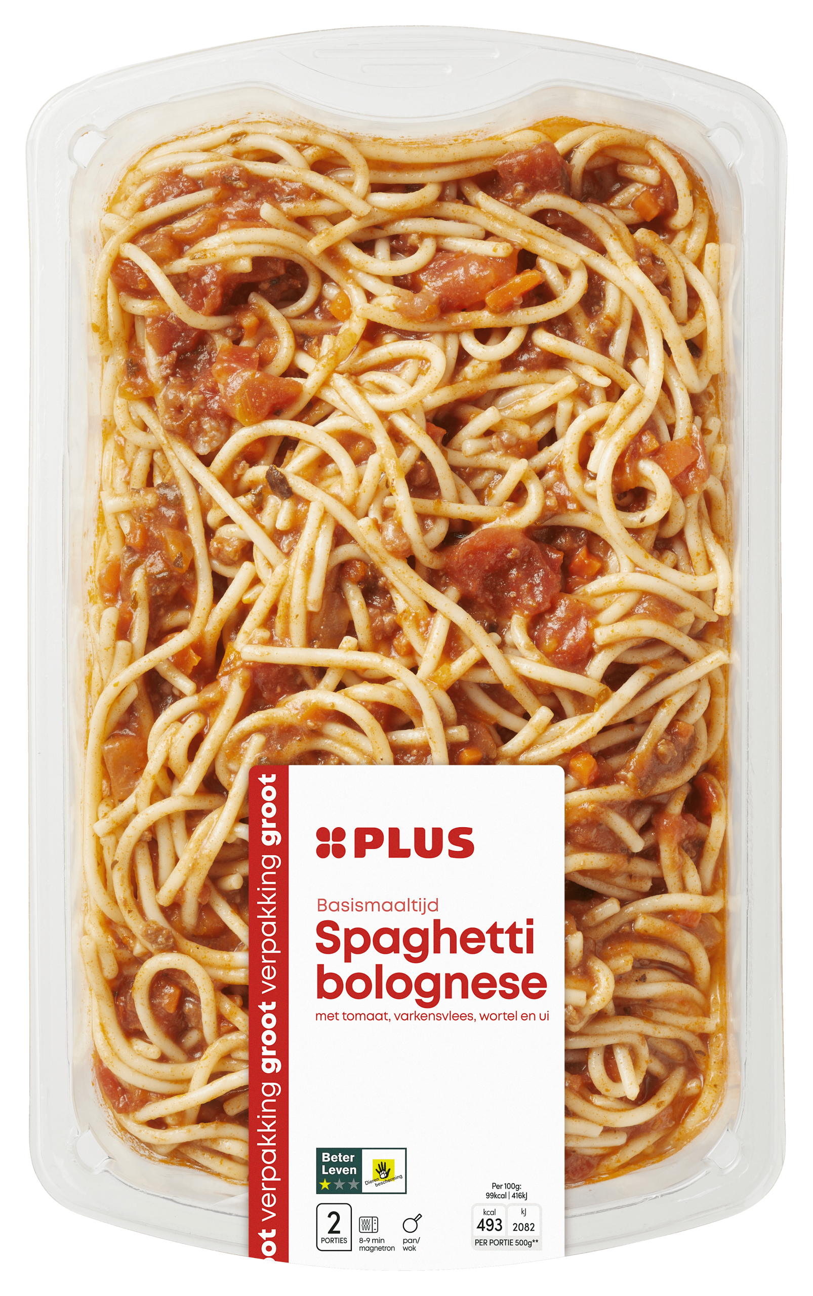 Geniet van de heerlijke PLUS Spaghetti, ideaal voor een snelle maaltijd. Deze maaltijd bestaat uit 60% bolognesesaus met een rijke smaak van tomaat, varkensvlees, wortel en ui, geserveerd met perfect gekookte spaghetti. Zeer eenvoudig te bereiden in de magnetron of pan. Gekoeld bewaren en snel op tafel!