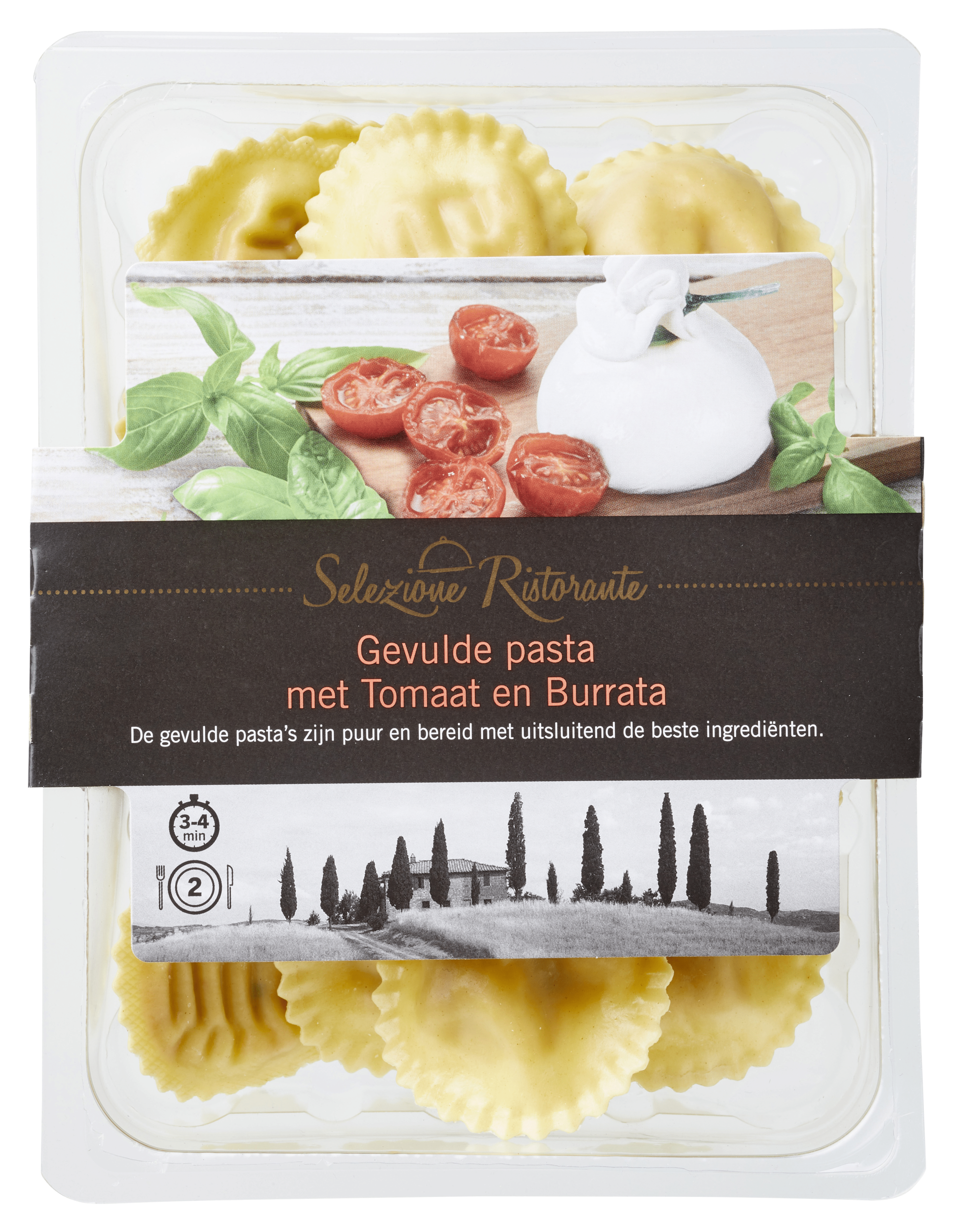 Ervaar de rijke smaken van Italiรซ met onze Selezione Ristorante gevulde pasta, mezzelune gevuld met sappige tomaat en romige burrata. Dit heerlijke gerecht brengt een culinaire ervaring op je bord, perfect voor elke gelegenheid. Eenvoudig te bereiden en ideaal voor een snelle maaltijd met een luxe uitstraling.