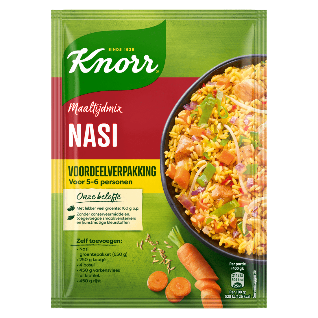 Ontdek de Knorr Nasi Maaltijdmix XXL, perfect voor een snelle en smaakvolle maaltijd voor 5 tot 6 personen. Deze mix is zorgvuldig gedroogd en bestaat uit een heerlijke combinatie van groenten en kruiden, zonder conserveermiddelen, kunstmatige kleurstoffen of smaakversterkers. Voeg eenvoudig je favoriete vlees of een vegetarische optie toe en geniet van een gerecht met maar liefst 160 gram groente per persoon.