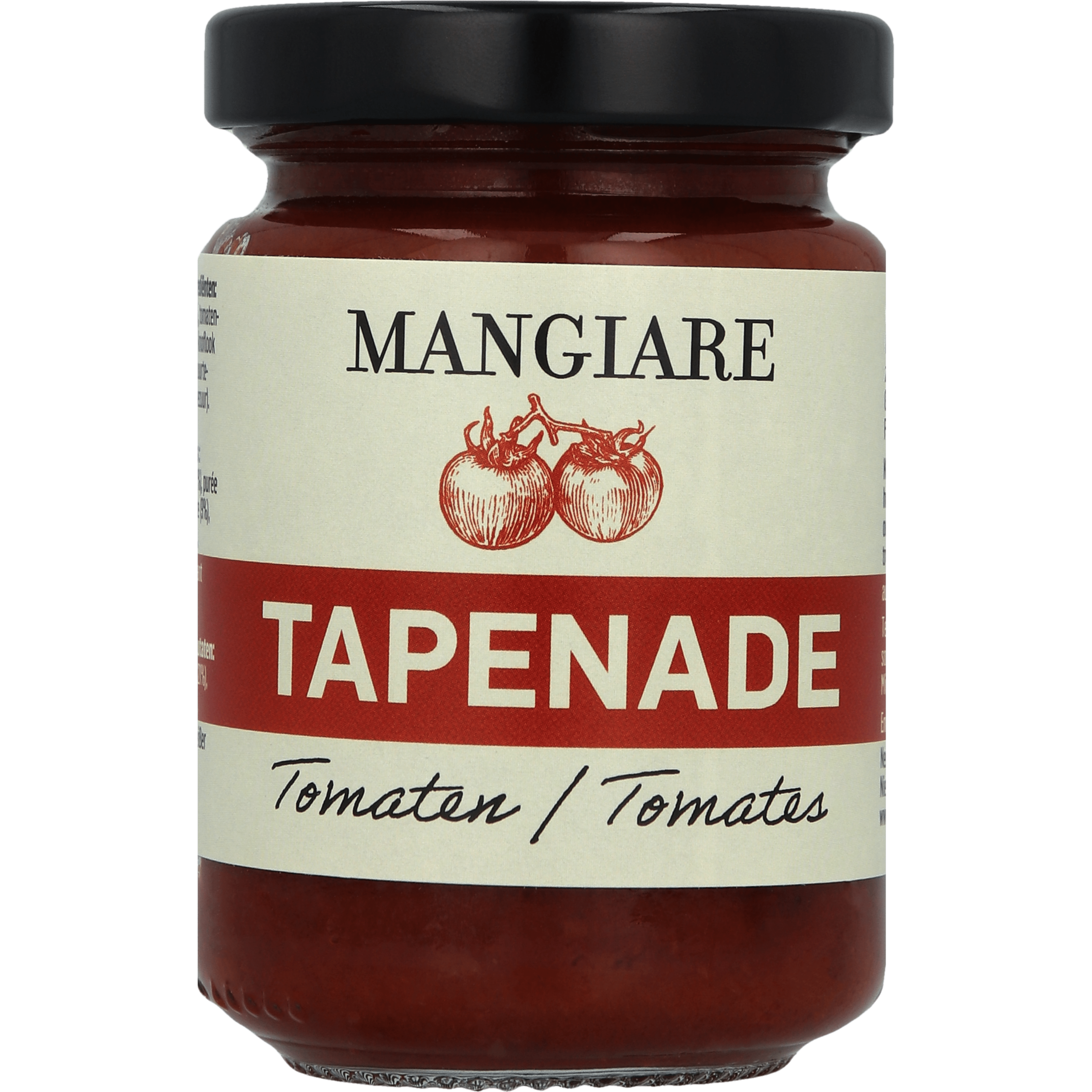 Ervaar de heerlijke smaak van Mangiare Tomatentapenade, een smaakvolle mix van zongerijpte en zongedroogde tomaten. Deze tapenade is perfect te combineren met vers stokbrood, op toastjes, als dip bij snacks of door salades. Gemaakt zonder kunstmatige toevoegingen en conserveermiddelen, voor een puur en natuurlijk product dat ook ideaal is als ingrediรซnt in diverse gerechten.