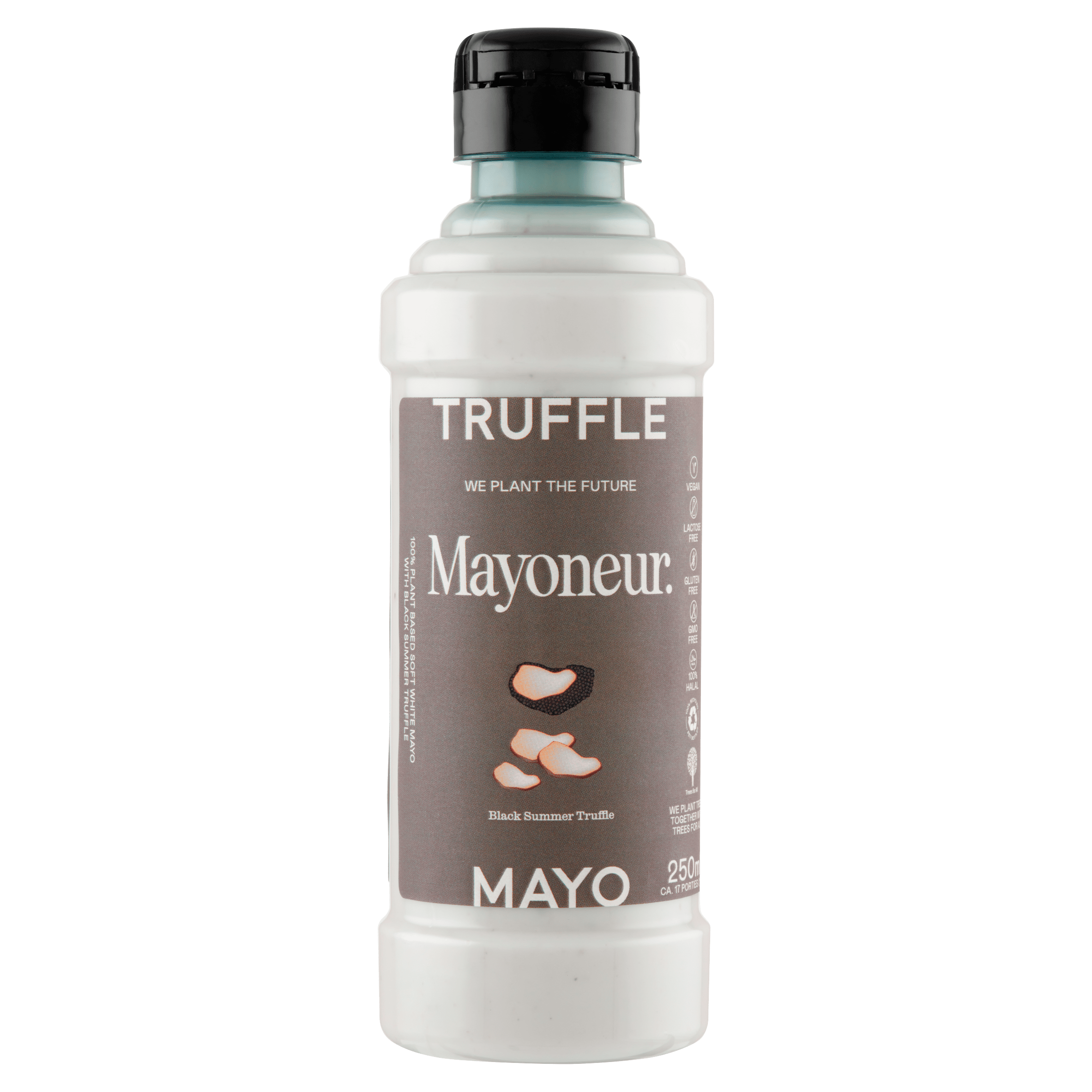 Ervaar de unieke smaak van Mayoneur Truffel mayo, een 100% plantaardige mayonaise met de rijke smaak van zwarte zomer truffel. Deze mayo is gluten- en lactosevrij, GMO-vrij en 100% halal. Perfect voor een luxe twist aan je gerechten of als smaakmaker op brood.