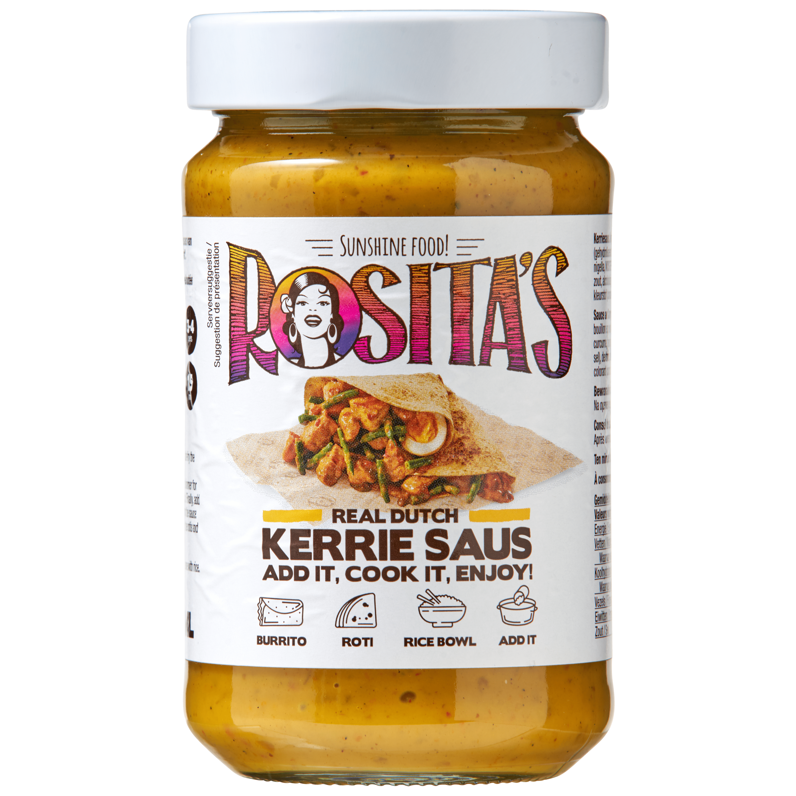 Rositaโs Kerriesaus is een heerlijke fluweelzachte kruidensaus van Hindoestaanse origine met een verfijnde Surinaamse โtwistโ. Perfect voor het bereiden van een aromatische curry met kip of een vegetarische variant. Deze veelzijdige saus verrijkt elke maaltijd met zijn unieke smaken. Bewaar de saus koel en droog en na opening in de koelkast, consumeer binnen 5 dagen voor optimale versheid.