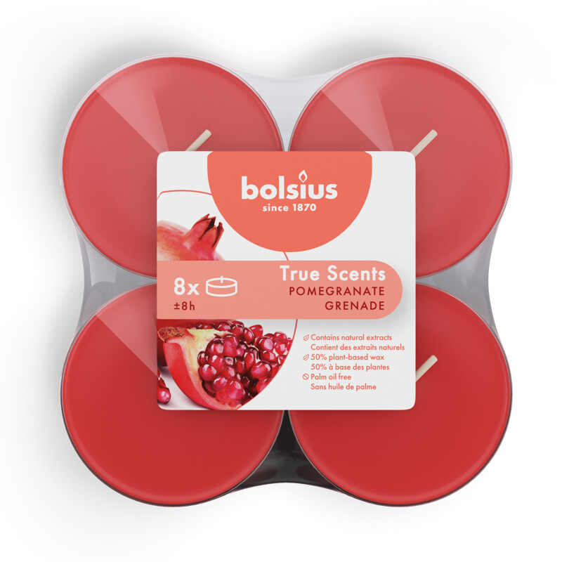 Breng de frisse geur van de zomer in huis met de Bolsius Maxi Geurtheelichten in de overheerlijke geur van granaatappel. Deze rozerode waxinelichtjes branden tot wel 8 uur lang en zijn gemaakt met natuurlijke extracten en vegan wax, zonder palmolie of dierlijke vetten. Geniet van de zoete, sappige geur van granaatappel en creรซer een warme, uitnodigende sfeer in je woonkamer.