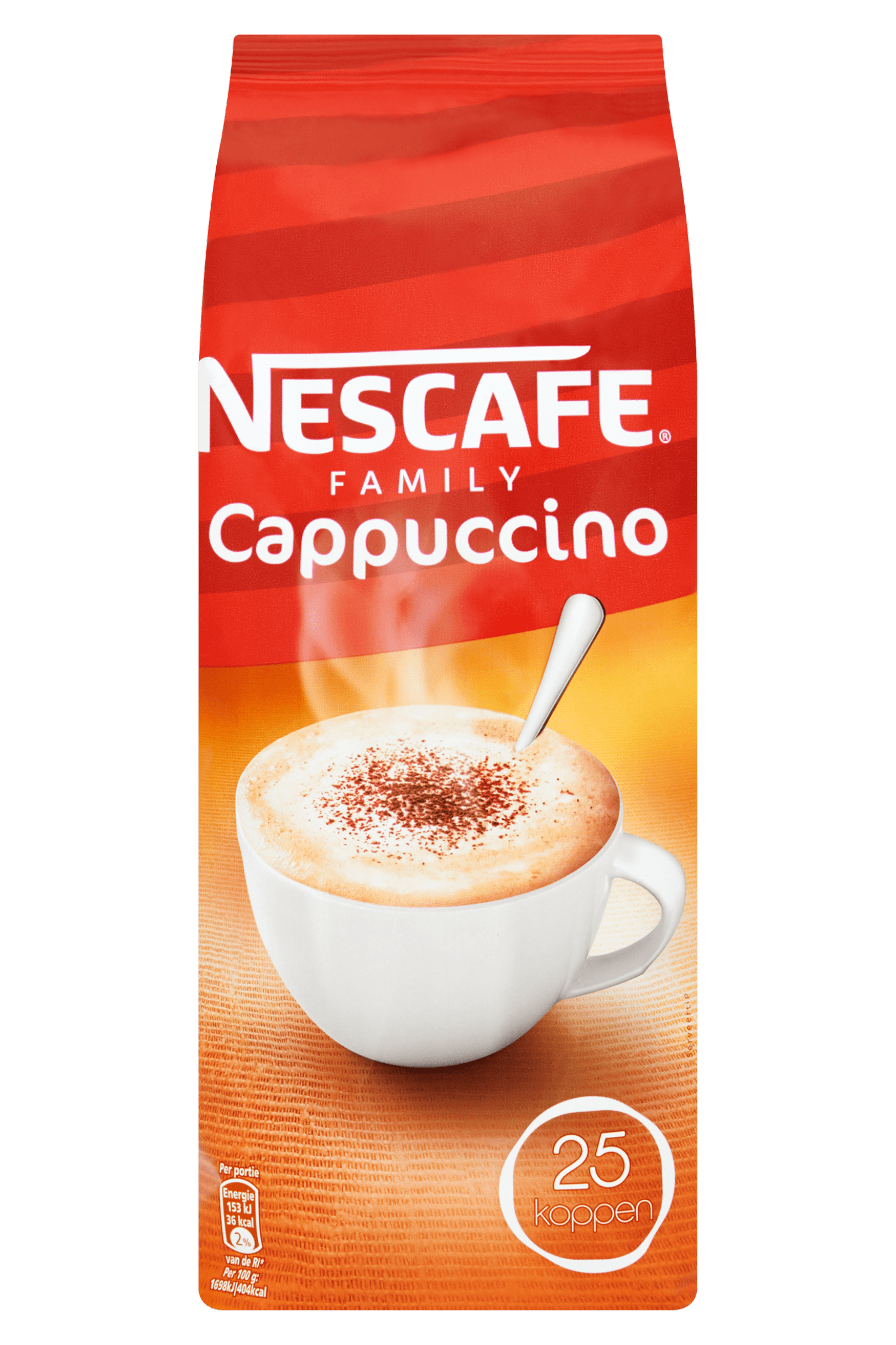 Geniet van een heerlijke cappuccino met de Nescafe Oploskoffie Cappuccino Family. Deze oploskoffie is eenvoudig te bereiden: voeg slechts 100 ml heet water toe en je creรซert een romige cappuccino met een volle melkschuimlaag. Gemaakt van verantwoord geteelde koffiebonen en ideaal om thuis van te genieten. Perfect als navulverpakking en ontworpen voor optimale kwaliteit.