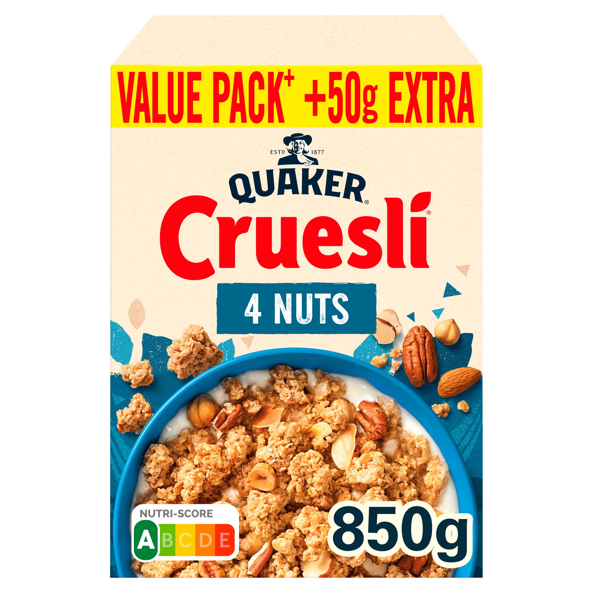 Begin je dag goed met Quaker Cruesli 4 noten! Deze heerlijke, knapperige granenmix bevat goudbruin geroosterde havermout en een smaakvolle mix van amandelschijfjes, hazelnoten, pecannoten en paranoten. Met maar liefst 95% volkoren granen en de Nutri-Score A is dit niet alleen een verrukkelijke, maar ook een voedzame keuze voor je ontbijt. Bereid het gemakkelijk met magere yoghurt voor een gezonde start van de dag.