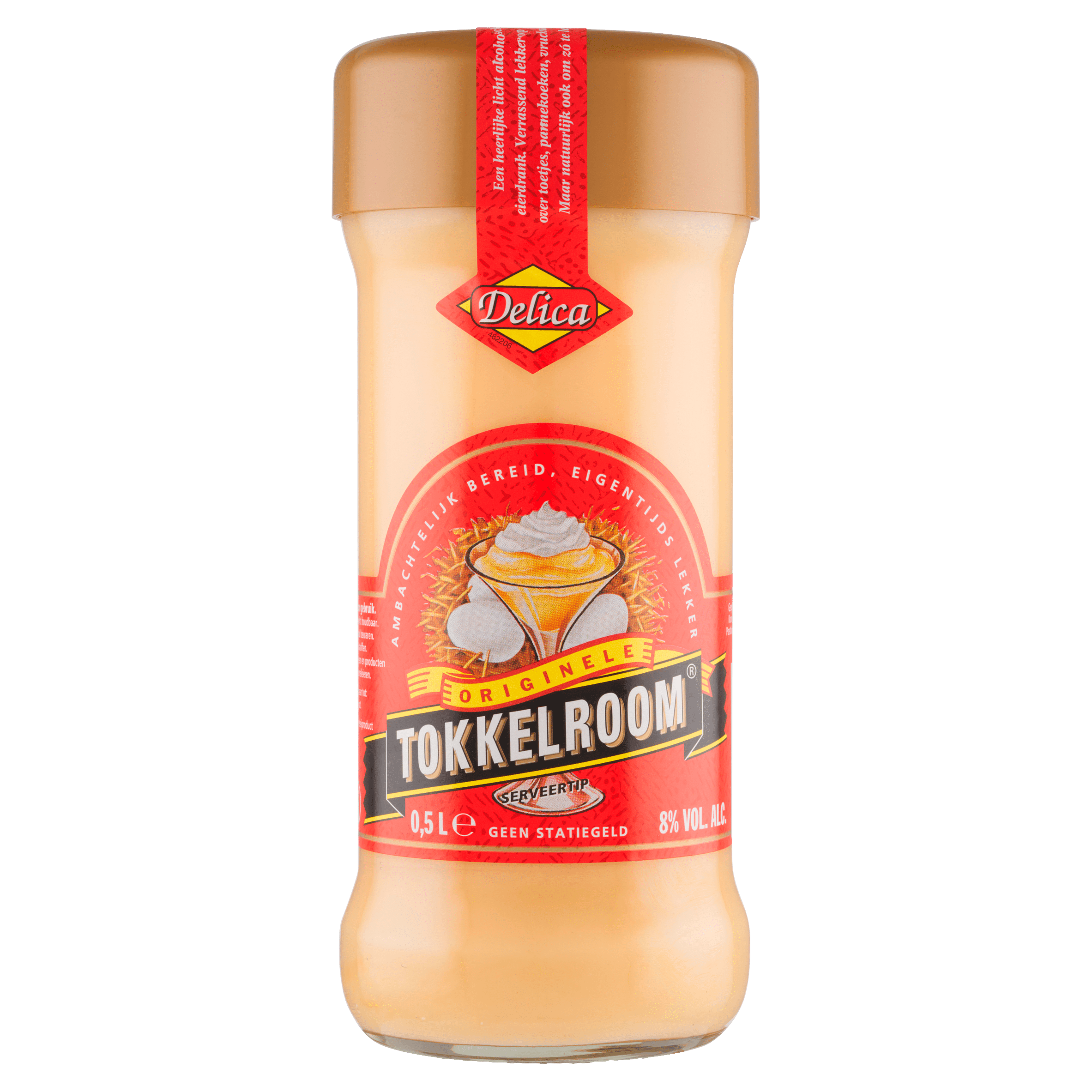 Geniet van de zachte smaak van Delica Tokkelroom, een heerlijke likeur op basis van alcohol, suiker en eieren. Met een alcoholpercentage van 8% is deze romige drank perfect te combineren met koekjes, gebak of als verrijking van je toetjes. Vergeet niet goed te schudden voor gebruik en tot gebruik gekoeld en staand te bewaren.