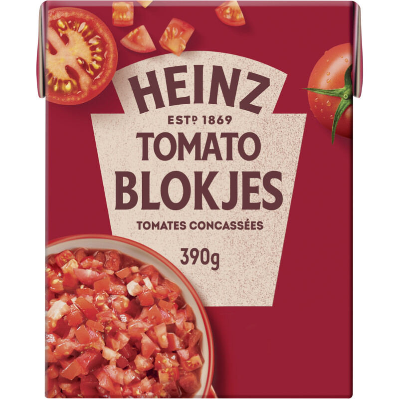 Heinz Tomaten Blokjes Naturel zijn gemaakt van de beste kwaliteit zongerijpte tomaten, die zorgen voor een onweerstaanbare, volle smaak. Deze blokjes vormen een rijke en sappige basis, perfect voor soepen, pastasauzen, couscous en tal van andere gerechten. De tomaten zijn geteeld in de open lucht, zonder toegevoegde smaakstoffen of conserveermiddelen. Met Heinz weet je zeker dat je natuurlijke ingrediรซnten in je keuken hebt.