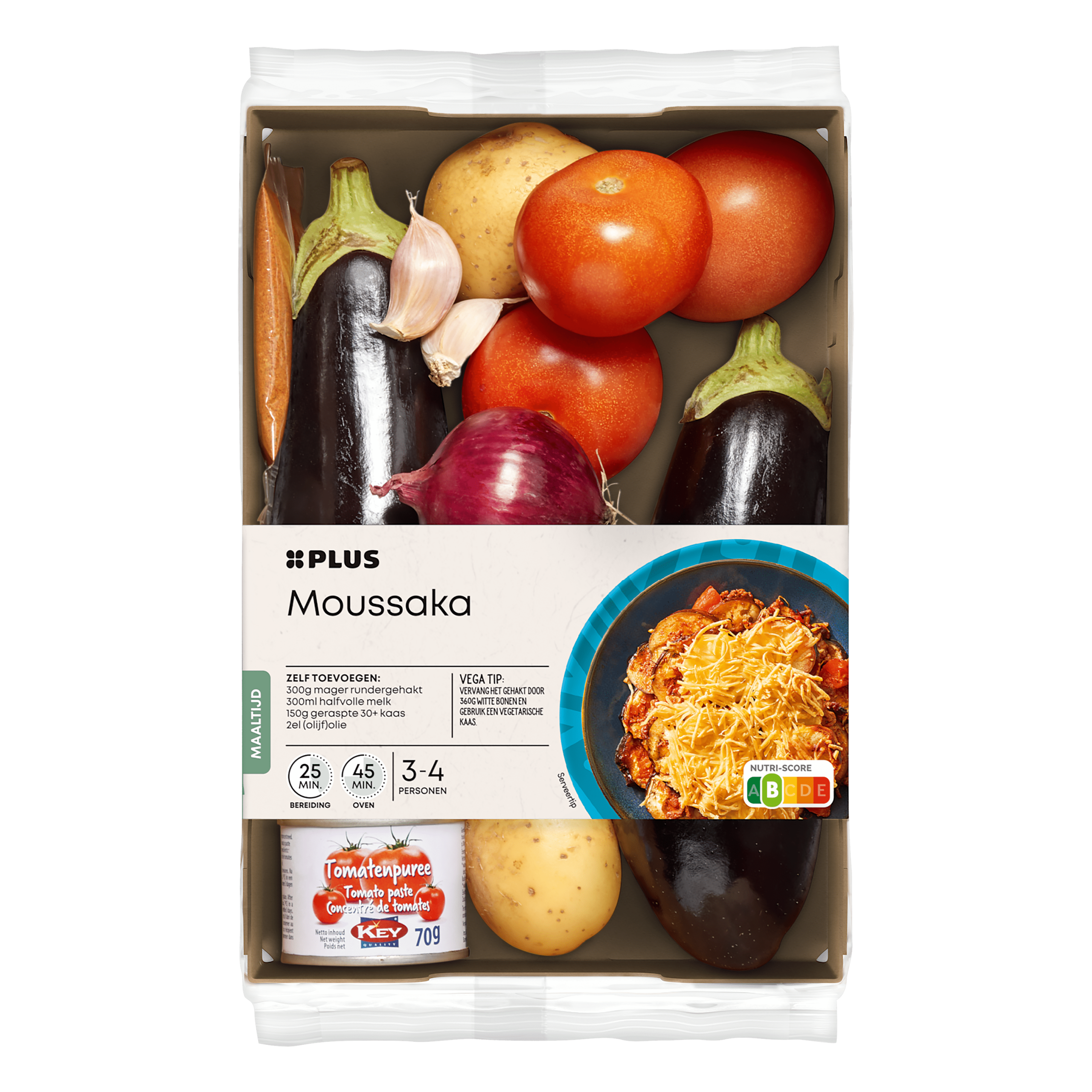 Geniet van een heerlijke zelfgemaakte moussaka met het PLUS Verspakket Moussaka. Dit pakket bevat verse groenten zoals aubergine, tomaat, aardappel en rode ui, samen met een blikje tomatenpuree en een unieke specerijenmix. Ideaal voor een snelle en smakelijke maaltijd voor 3-4 personen in slechts 70 minuten. Eenvoudig te bereiden en perfect voor zowel de vleesliefhebber als de vegetariรซr. Vervang het gehakt door witte bonen voor een smakelijke vegetarische variant.