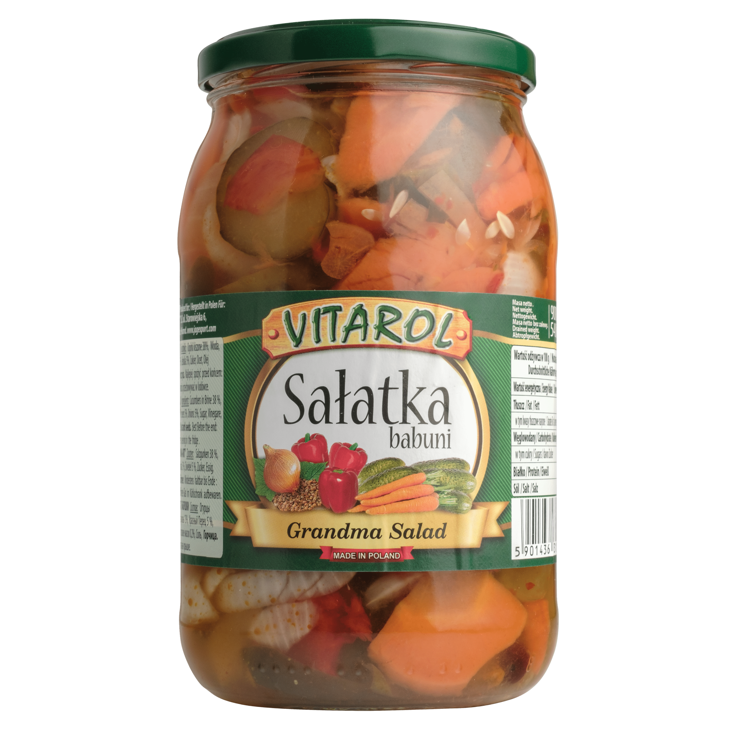 Geniet van de authentieke smaak van Vitarol omasalade, grootmoeders favoriet! Deze heerlijke salade bevat lekkere komkommers in pekel, wortelen, en een mix van verse groenten en kruiden. Perfect als bijgerecht of als smakelijke toevoeging aan je brood of wraps. Gekoeld bewaren na opening voor optimale versheid.