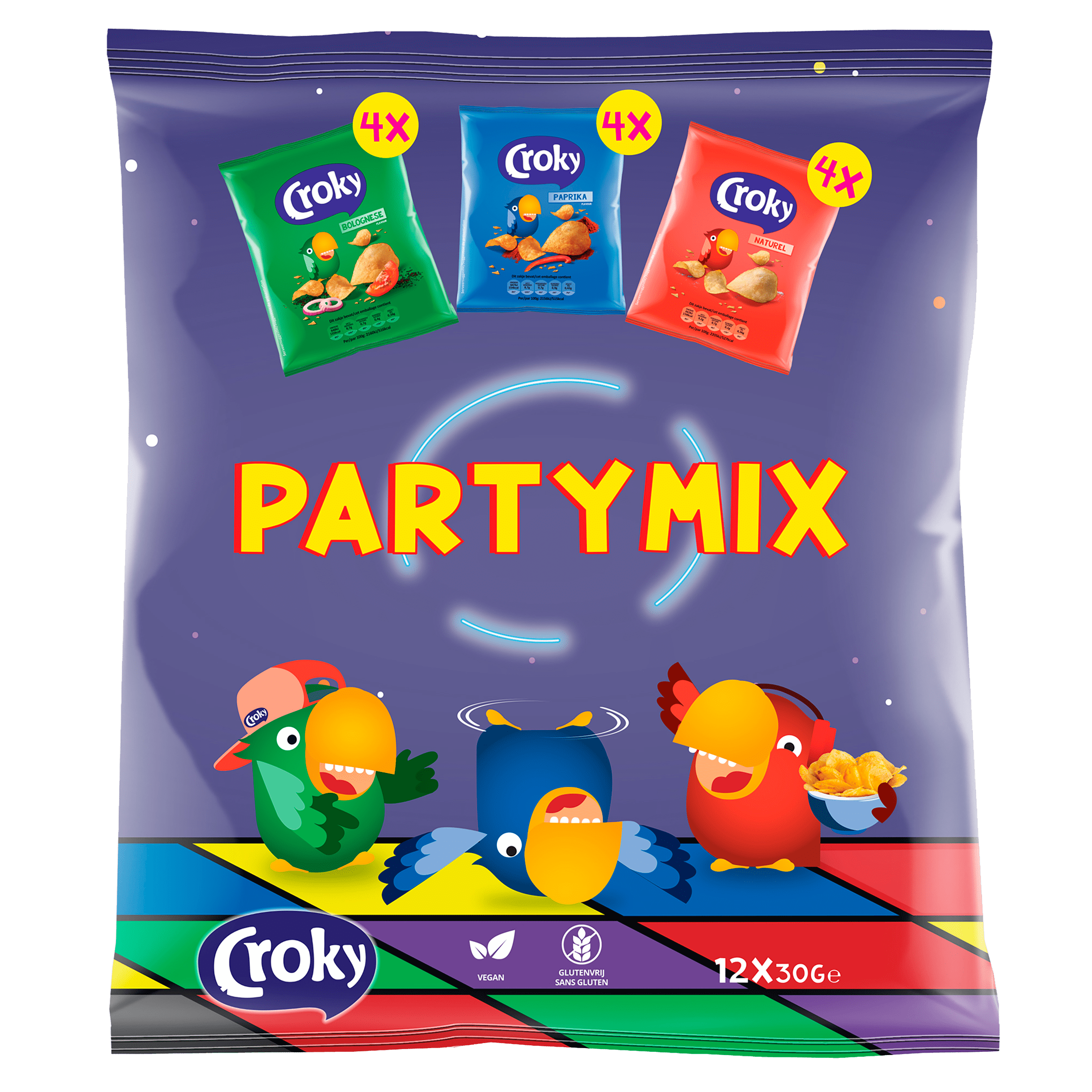 Geniet van de heerlijke Croky Partymix, een selectie van gezouten aardappelchips met verschillende smaken zoals paprika en bolognesesmaak. Perfect voor borrels, feestjes of als snack tussendoor. Deze veganistische chips zijn eenvoudig te bewaren in een koele en droge omgeving.