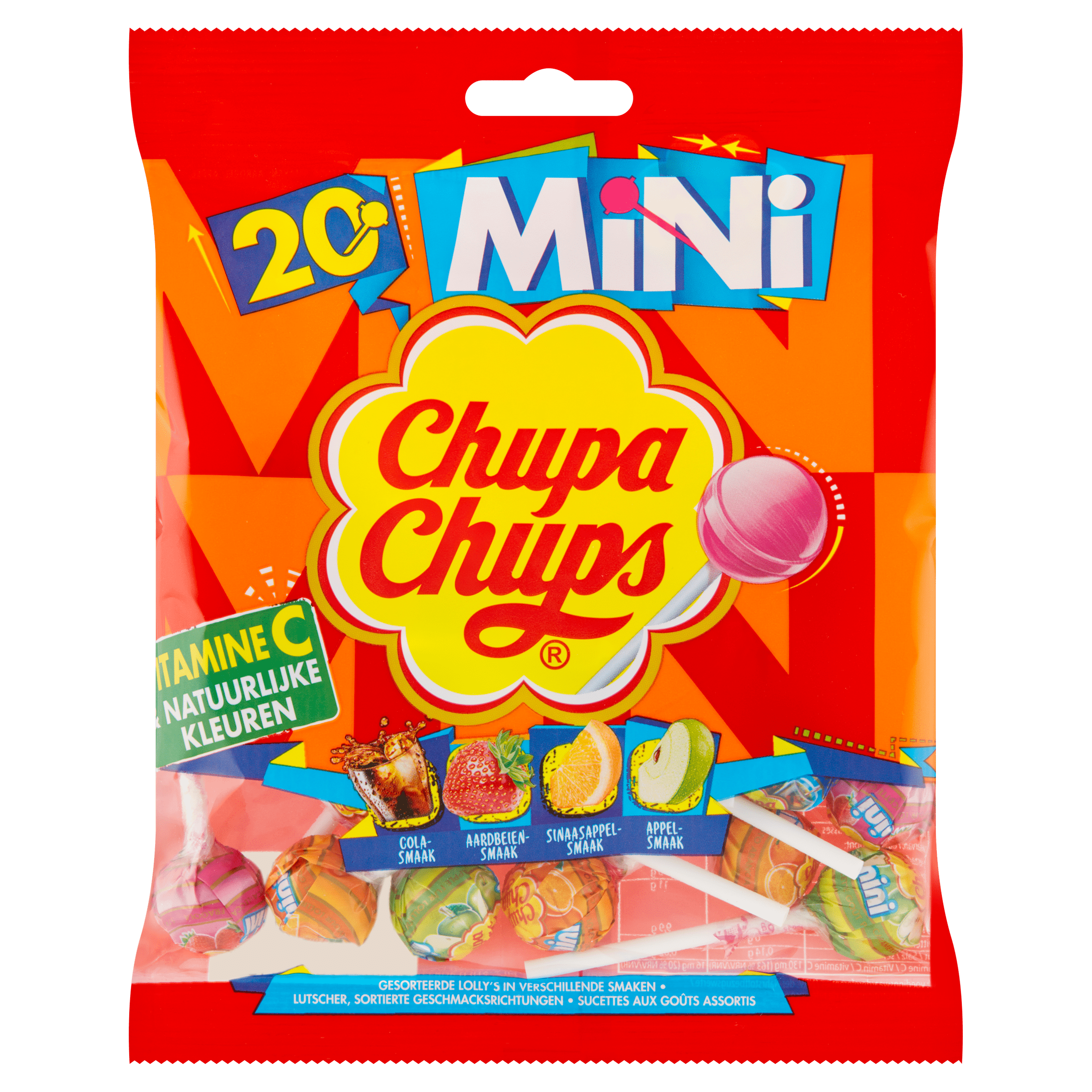 Geniet van de heerlijke smaken van Chupa Chups Mini, perfect voor jong en oud! Deze zak bevat 20 mini lolly’s in smaken zoals sinaasappel, appel, aardbei en cola, ideaal om met vrienden te delen of als traktatie. De lolly’s zijn voorzien van een papieren stokje en zijn een leuke toevoeging voor elke gelegenheid. Elke lolly zit vol vitamine C, wat bijdraagt aan een gezonde levensstijl.