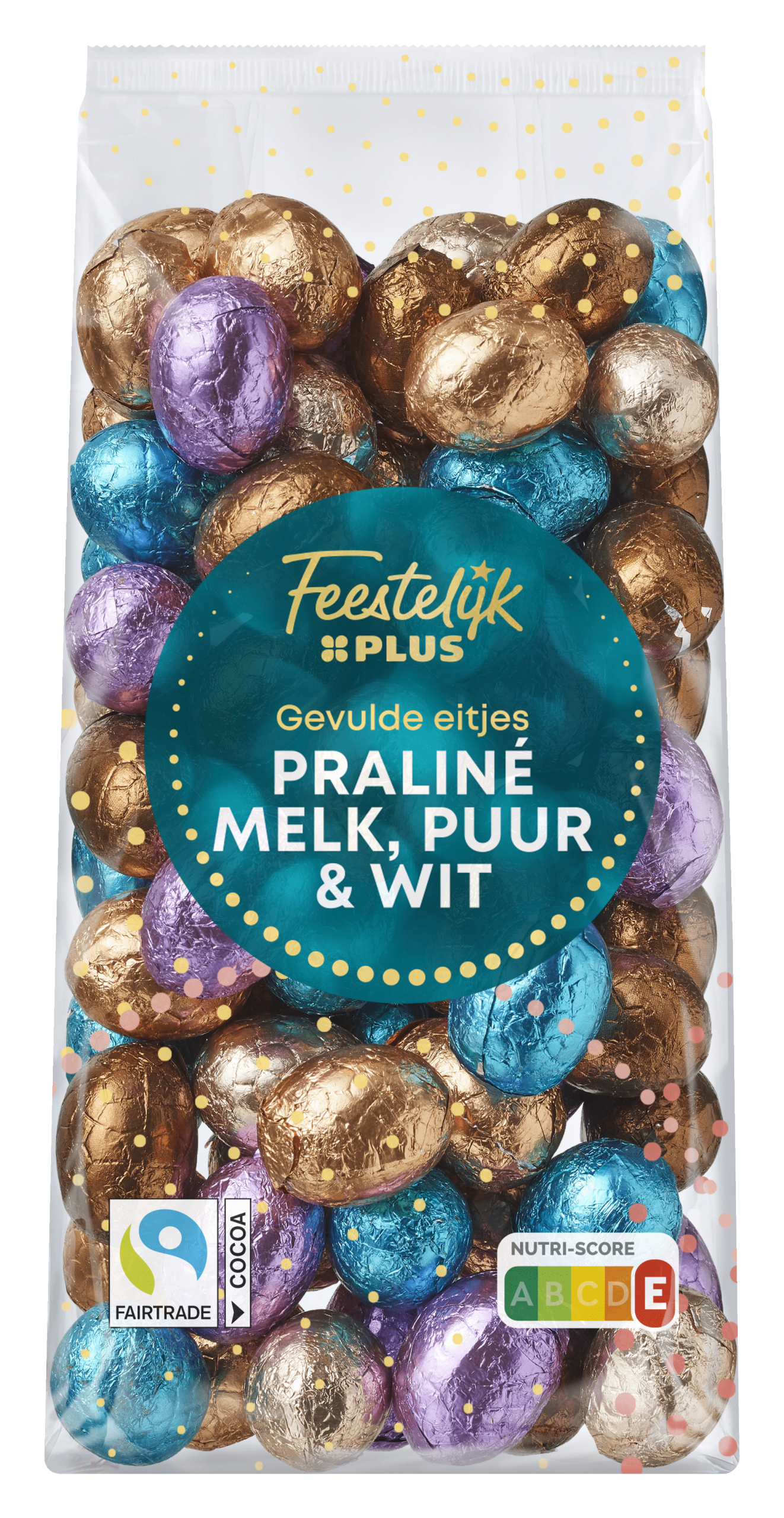 Geniet van de feestelijke PLUS Paaseitjes Mix gevuld met een heerlijke hazelnootvulling! Deze mix bevat een combinatie van pure, melk- en witte chocolade-eitjes, verpakt met zorg en Fairtrade cacao. Perfect voor de paastijd of als lekkernij tijdens een feestje. Bewaar ze koel en droog om optimaal te kunnen genieten van deze verrukkelijke chocolade-eitjes.