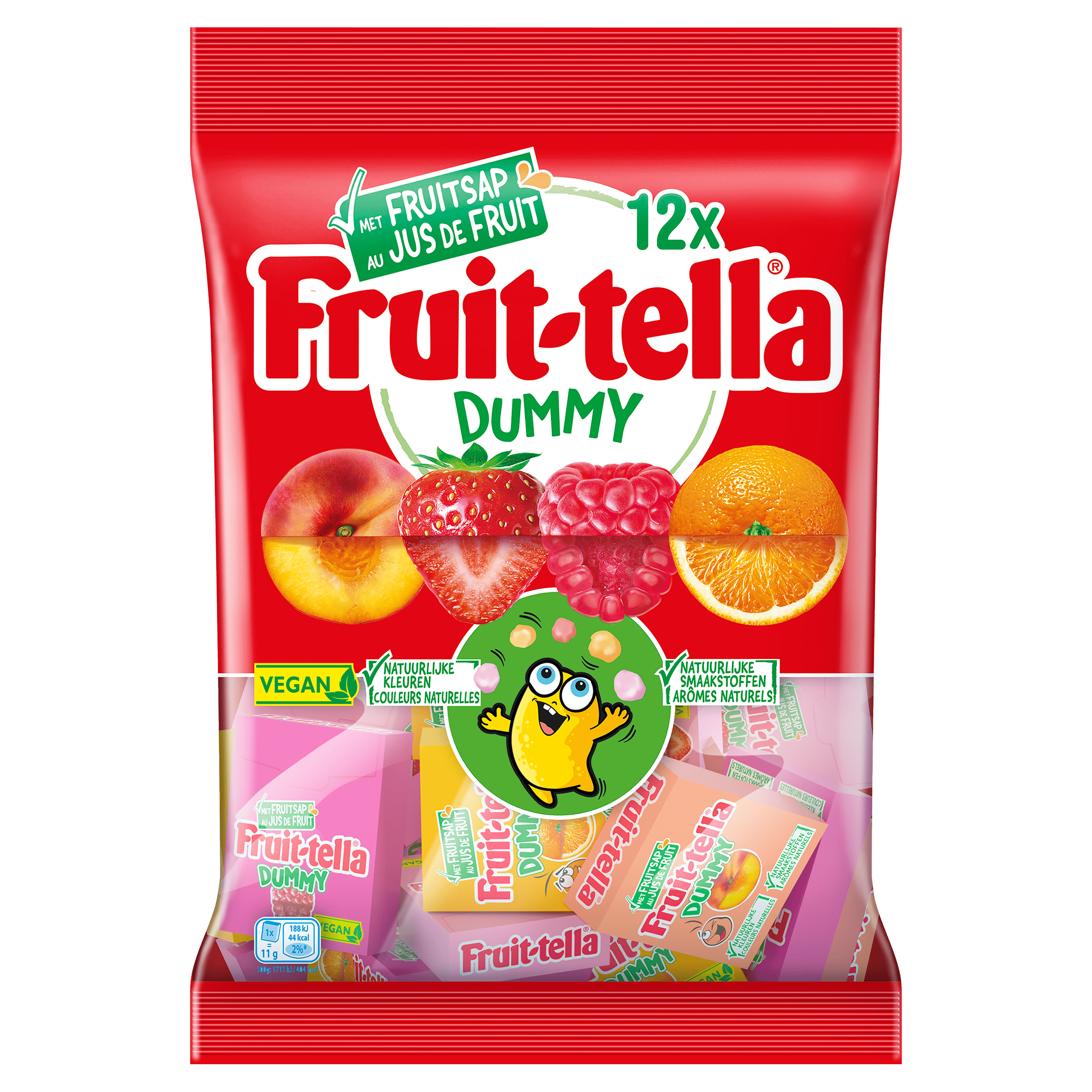 Geniet van de Fruittella Dummy’s, een heerlijke vegan traktatie gemaakt met fruitsap en natuurlijke smaakstoffen. Ideaal voor het delen, deze aparte snoepjes zijn verkrijgbaar in de smaken aardbei, perzik, sinaasappel en framboos. Met 12 doosjes in een verpakking vind je altijd een moment om van deze fruitige lekkernijen te genieten!
