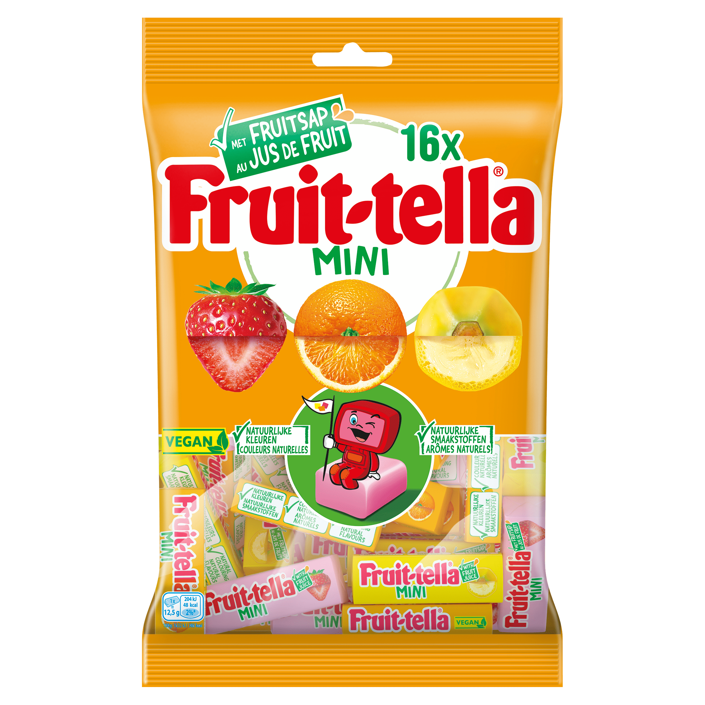 Geniet van de smaakvolle Fruittella Mini vegan snoepjes, gemaakt met fruitsap en natuurlijke ingrediรซnten. Deze apart verpakte snoepjes zijn perfect om te delen en komen in de verfrissende smaken aardbei, citroen en sinaasappel. Ideaal voor een feestje of als traktatie!