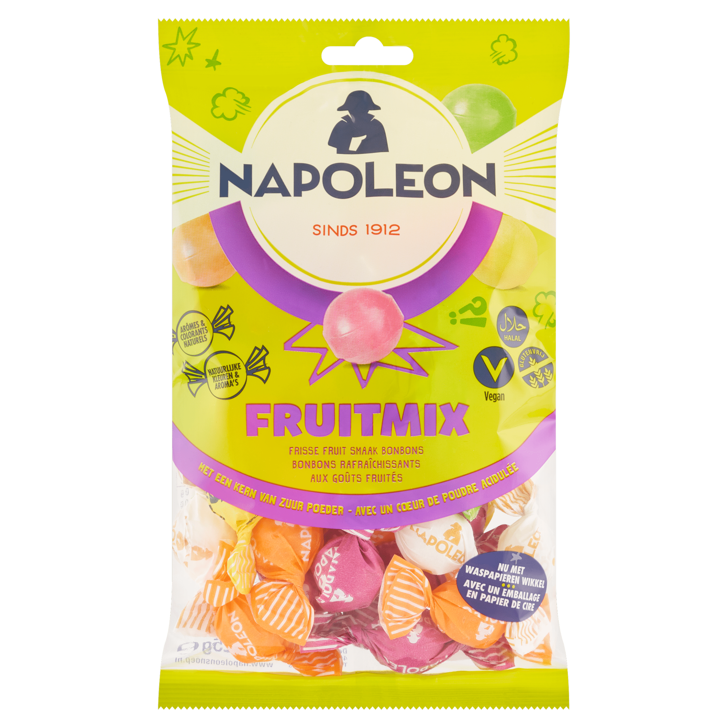 Geniet van de heerlijke Napoleon Fruitmix, een assortiment van frisse fruitsmaak bonbons met een verrassende kern van zuur poeder. Deze veganistische lekkernij is gemaakt met natuurlijke kleuren en aroma’s, zonder kunstmatige toevoegingen. Elke verpakking bevat handige, per stuk verpakte kogels, ideaal om mee te nemen of uit te delen. Koel en droog bewaren voor de beste smaakbeleving.