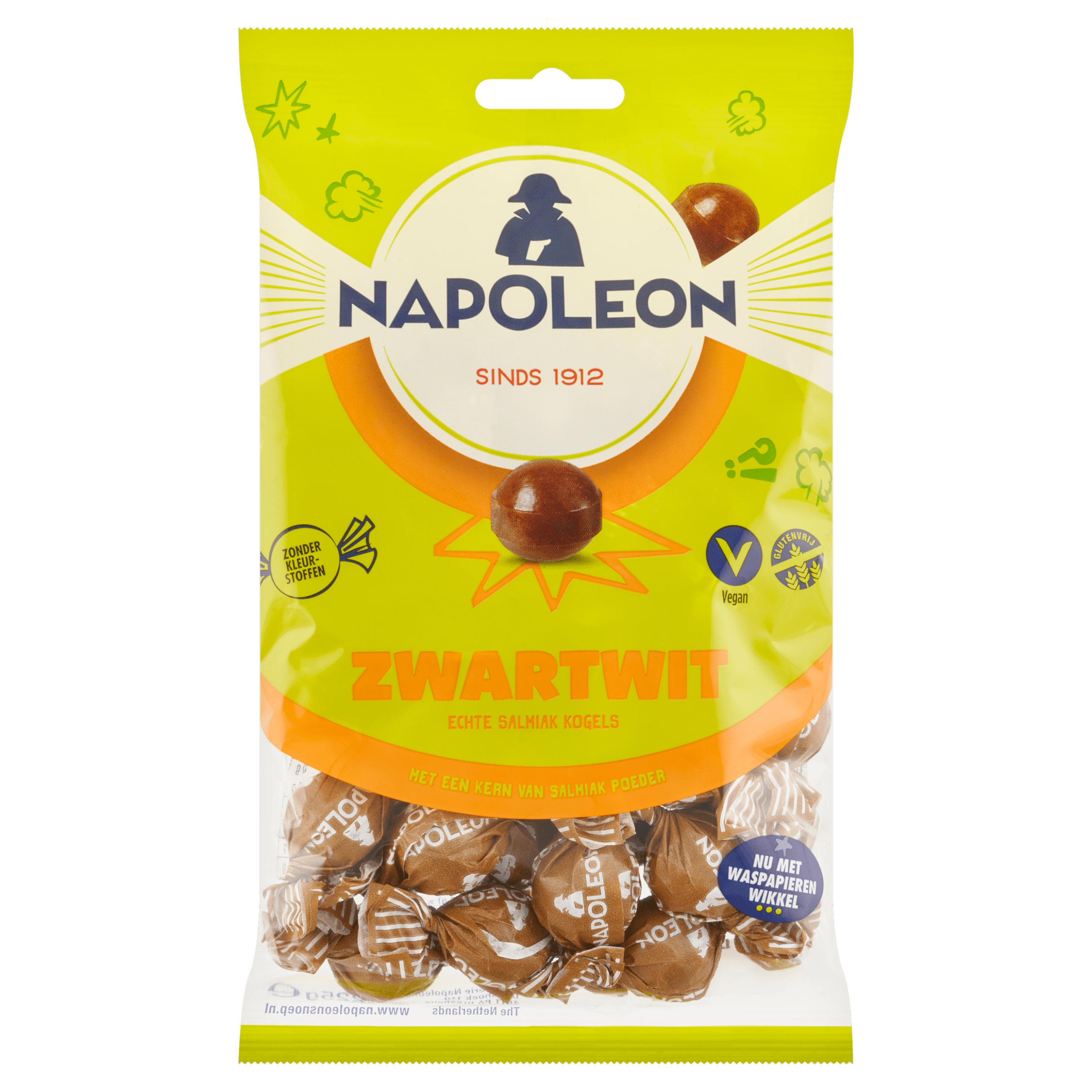 Geniet van de unieke smaak van Napoleon Zwart Wit, een heerlijk hard suikerwerk met een verrassing in de kern van salmiakpoeder. Deze veganistische traktatie is gemaakt met hoogwaardige, natuurlijke ingrediรซnten en is vrij van kleurstoffen. Perfect om 6 minuten lang van te genieten! Elke kogel is afzonderlijk verpakt, wat ze ideaal maakt om mee te nemen of te delen. Bewaar ze koel en droog voor de beste kwaliteit.