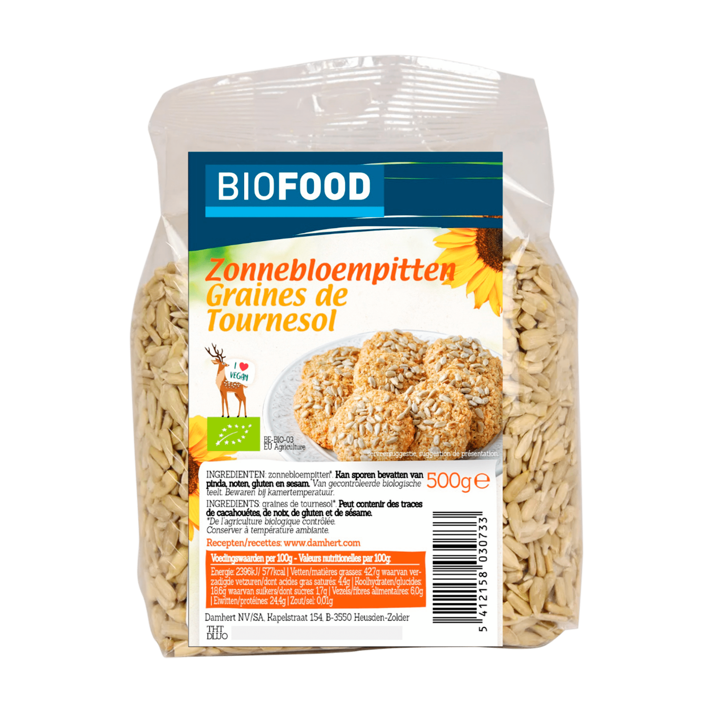 Geniet van de heerlijke smaak en de talrijke voordelen van Damhert Biofood Zonnebloempitten. Deze gepelde, biologische zonnebloempitten zijn perfect als verantwoord tussendoortje, als veganistische snack of als smaakvolle topping bij plantaardige yoghurt en muesli. Verder zijn ze uitstekend toe te voegen aan brooddeeg of kort aangebakken in salades en sauzen. Bewaar ze eenvoudig bij kamertemperatuur voor langdurige versheid.
