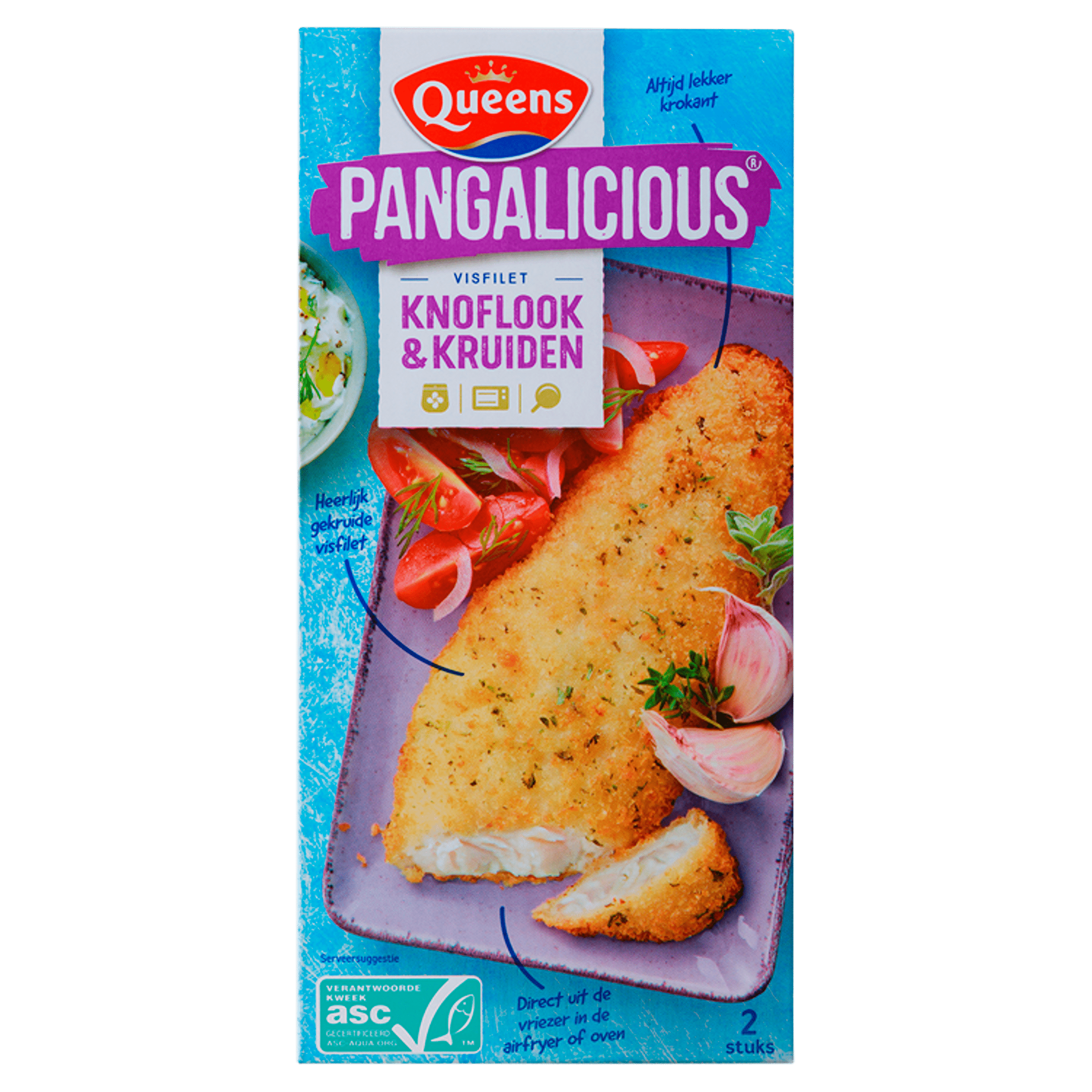 Geniet van de heerlijke smaak van Queens Pangalicious Knoflook & Kruiden. Deze zachte pangasiusfilet is omhuld met een krokant en smakelijk kruidenjasje. Perfect voor een warme maaltijd of als smakelijke lunch op een knapperig broodje. Eenvoudig te bereiden in de airfryer voor een snelle en overheerlijke maaltijd.