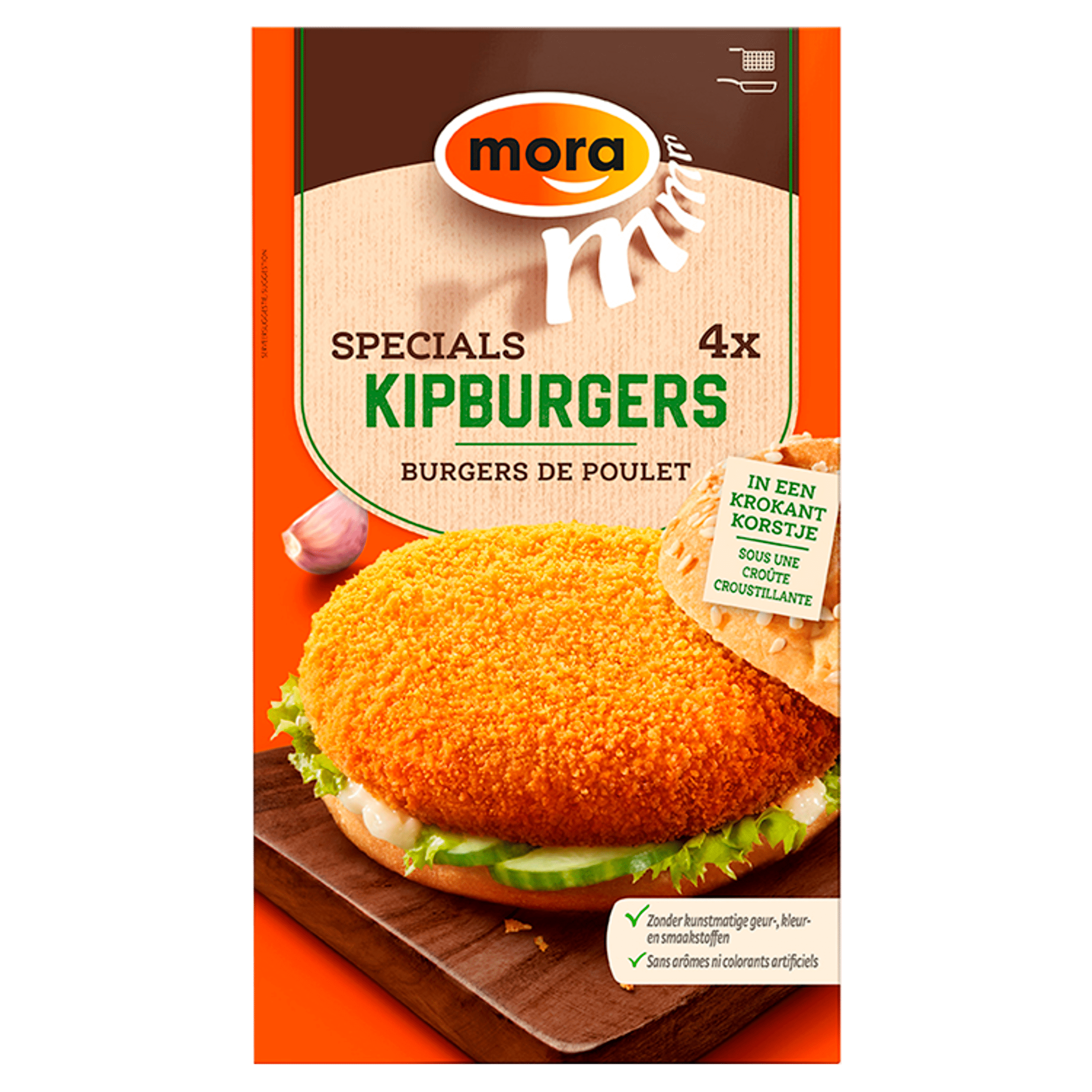 Geniet van de Mora Specials Kipburgers, een heerlijke snack bereid met 100% malse kip, perfect gekruid met knoflook en zwarte peper. Deze sappige burgers zijn omhuld met een krokant korstje en ideaal om snel te bereiden. Geschikt voor een lekkere maaltijd of als tussendoortje. Bereid in de friteuse in slechts 4 minuten, ideaal voor feestje of een avondje snacken. Een echte traktatie voor de hele familie!
