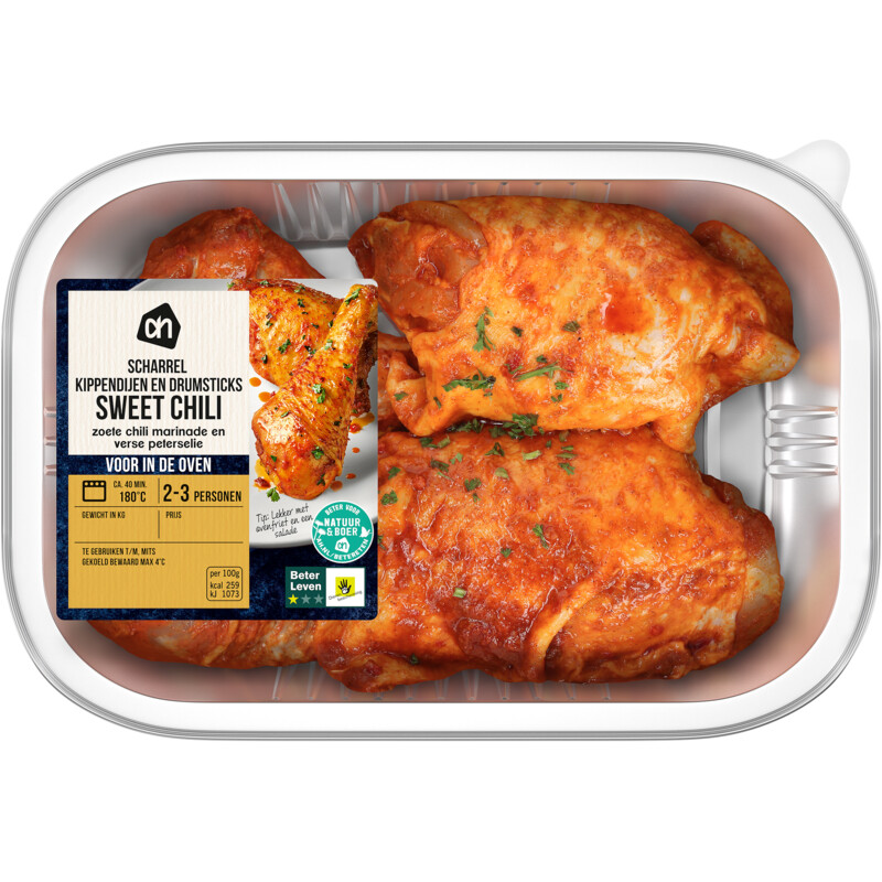 Geniet van de rijke smaken van onze AH Voor in de Oven Scharrel Kip Sweet Chili. Deze heerlijke schotel bestaat uit kippendijen en drumsticks, gemarineerd in een smaakvolle zoete chilimarinade met een hint van verse peterselie. Gemakkelijk te bereiden in de oven, perfect voor een doordeweekse maaltijd of een gezellig diner. Duurzaam geproduceerd met aandacht voor dierenwelzijn en het milieu. Een echt gemak voor de drukke kok!