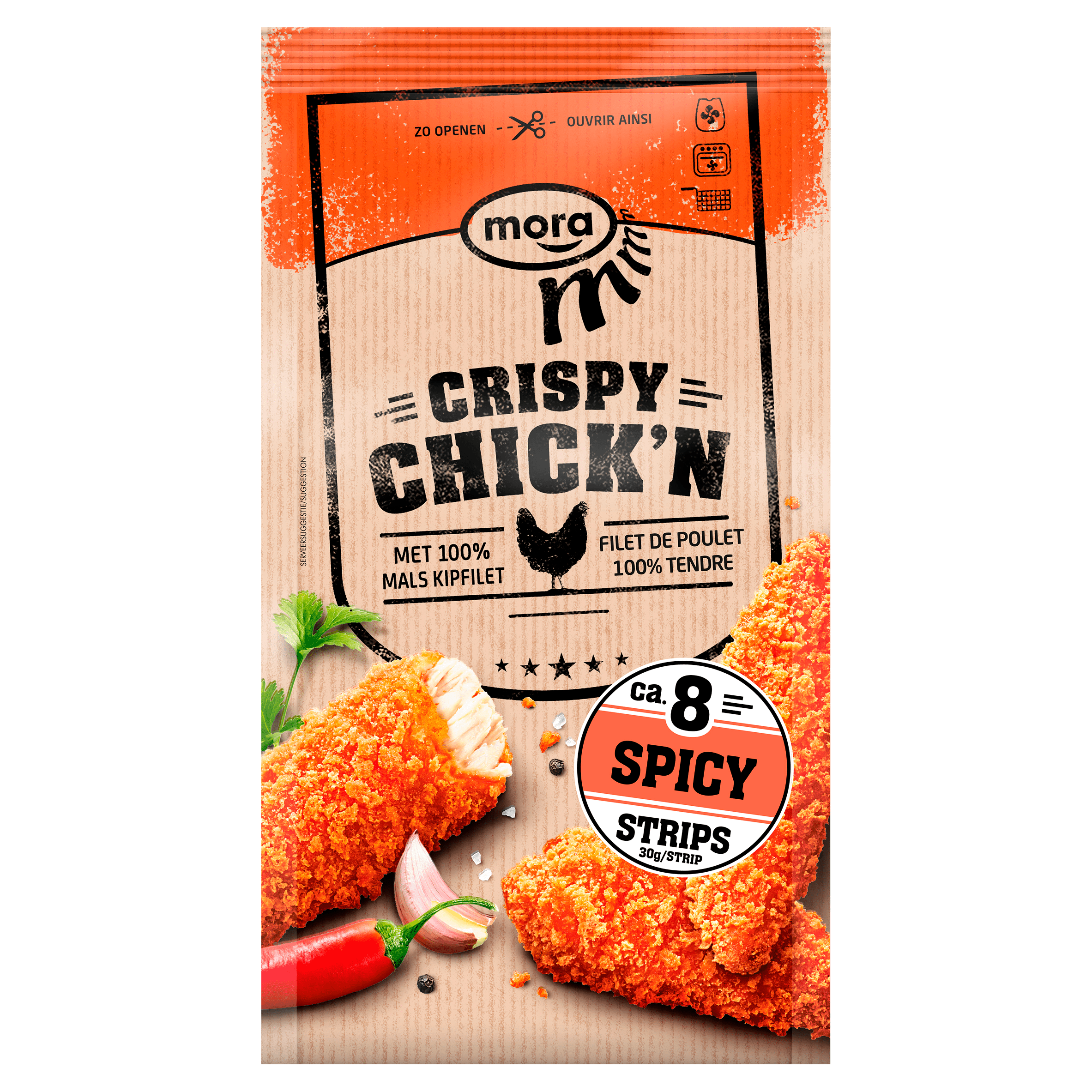 Geniet van de heerlijke, pittige smaak van Mora Crispy Chick’n Spicy. Deze mals gekruide kipfilet, omhuld met een knapperig korstje, is perfect voor bij de borrel of als maaltijd. Vriesvers en eenvoudig te bereiden in de airfryer in slechts 6 minuten. Een echte traktatie voor de liefhebbers van kip.