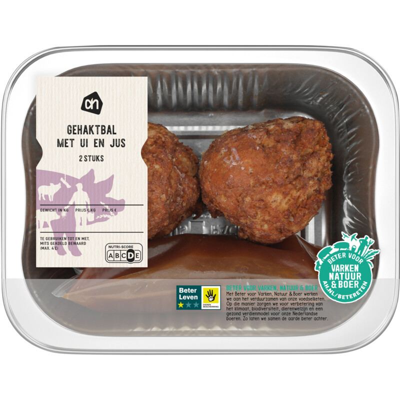 Geniet van de smaakvolle AH Oma’s gehaktbal met ui en jus. Deze vooraf gegrilde gehaktballen gemaakt van 56% varkensvlees zijn sappig en verrijkt met een smakelijke jus. Ideaal voor een snelle maaltijd; simpel, snel en lekker! Warm op in de oven of airfryer en serveer bij stamppot of als een smakelijk broodje met mosterd.